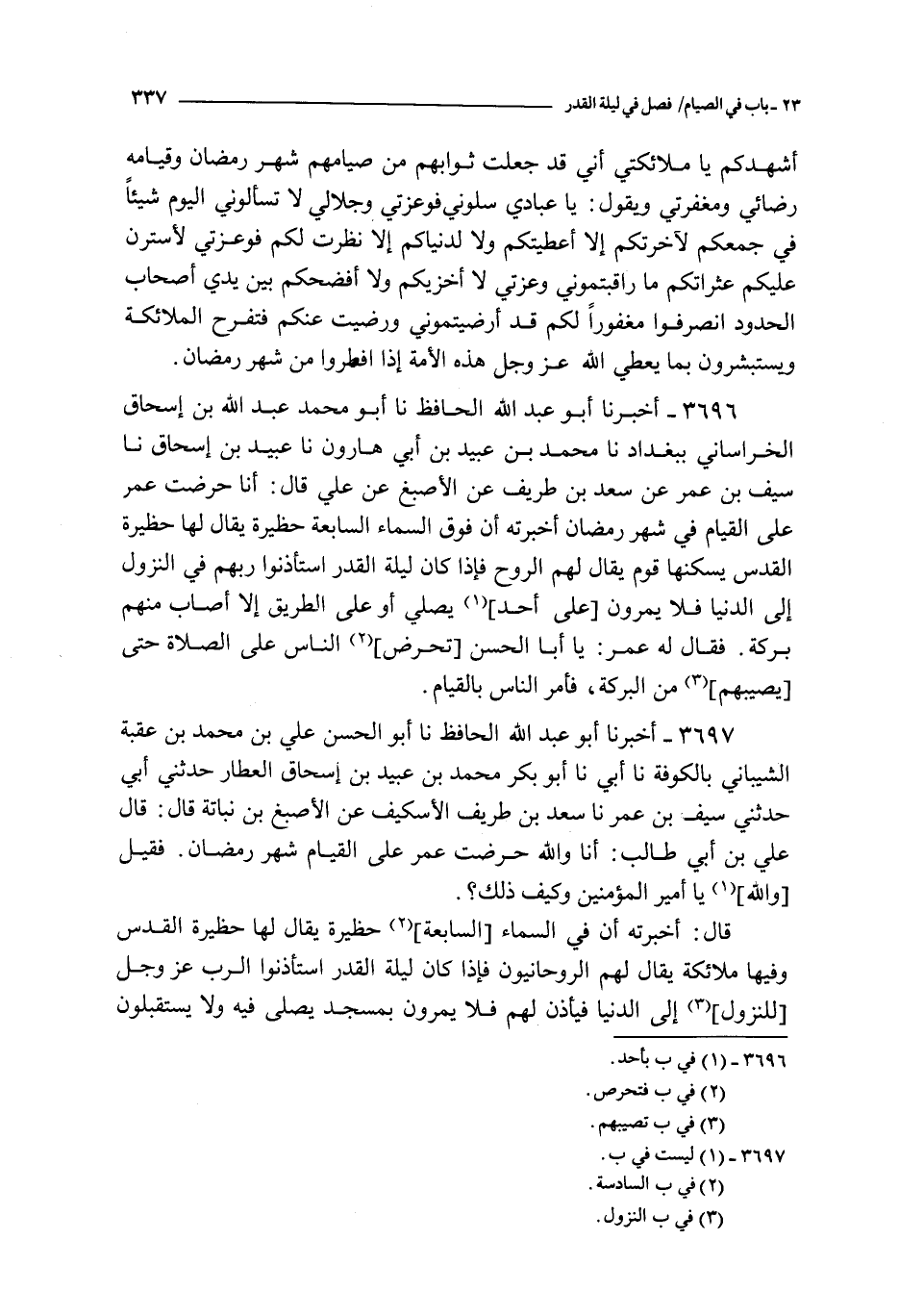 3696 - أخبرنا أبو عبد الله الحافظ نا أبو محمد عبد الله بن إسحاق الخراساني ببغداد نا محمد بن عبيد بن أبي هارون نا عبيد بن إسحاق نا سيف بن عمر عن سعد بن طريف عن الأصبغ عن علي قال : أنا حرضت عمر على القيام في شهر رمضان أخبرته أن فوق السماء السابعة حظيرة يقال لها حظيرة القدس يسكنها قوم يقال لهم الروح فإذا كان ليلة القدر استأذنوا ربهم في النزول إلى الدنيا فلا يمرون على أحد يصلي أو على الطريق إلا أصاب منهم بركة فقال له عمر : يا أبا الحسن تحرض الناس على الصلاة حتى يصيبهم من البركة فأمر الناس بالقيام