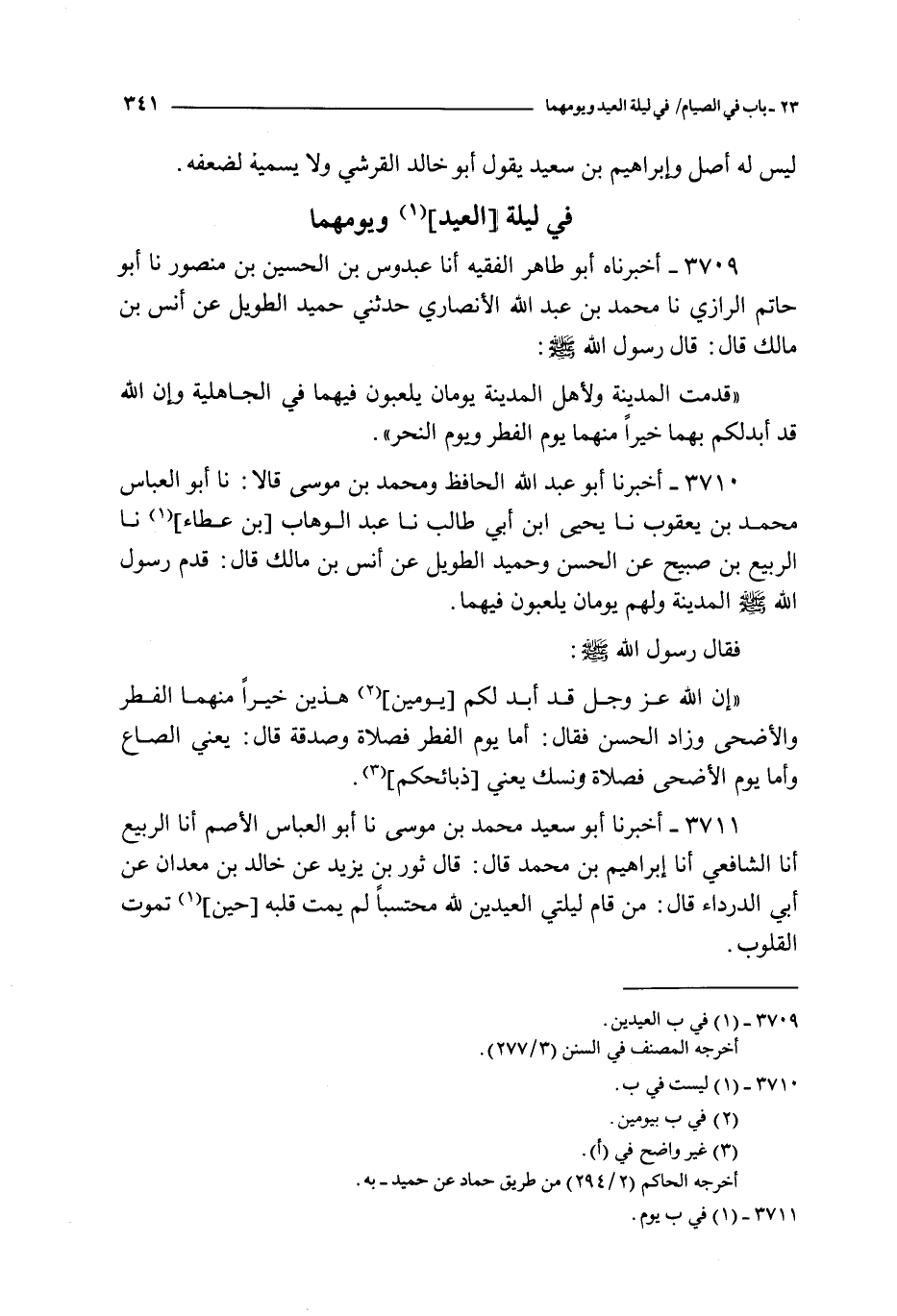 3711 - أخبرنا أبو سعيد محمد بن موسى نا أبو العباس الأصم أنا الربيع أنا الشافعي أنا إبراهيم بن محمد قال : قال ثور بن يزيد عن خالد بن معدان عن أبي الدرداء قال : من قام ليلتي العيدين لله محتسبا لم يمت قلبه حين تموت القلوب