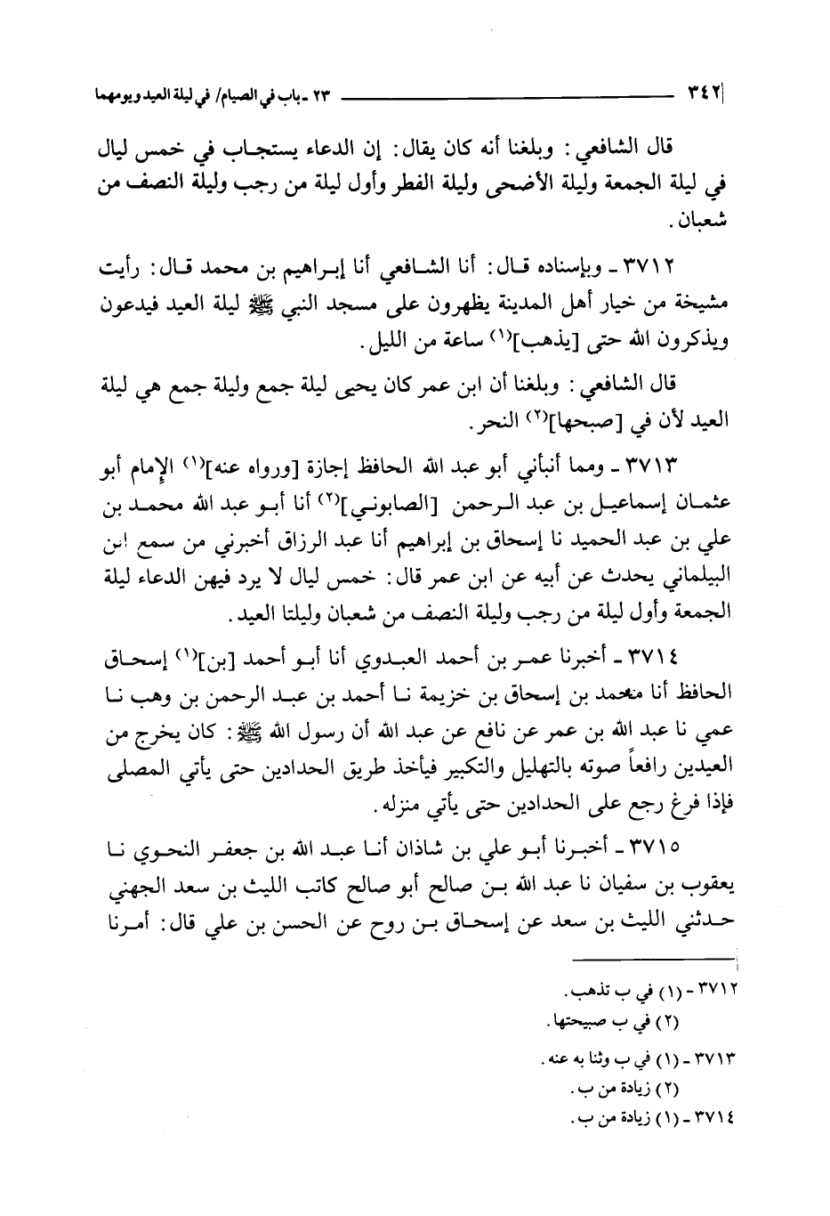 3712 - و بإسناده قال : أنا الشافعي أنا إبراهيم بن محمد قال : رأيت مشيخة من خيار أهل المدينة يظهرون على مسجد النبي صلى الله عليه و سلم ليلة العيد فيدعون و يذكرون الله حتى يذهب ساعة من الليل