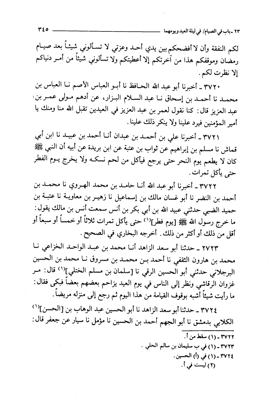3720 - أخبرنا أبو عبد الله الحافظ نا أبو العباس الأصم نا العباس بن محمد نا أحمد بن إسحاق نا عبد السلام البزار عن أدهم مولى عمر بن عبد العزيز قال : كنا نقول لعمر بن عبد العزيز في العيدين تقبل الله منا و منك يا أمير المؤمنين فيرد علينا و لا ينكر ذلك علينا