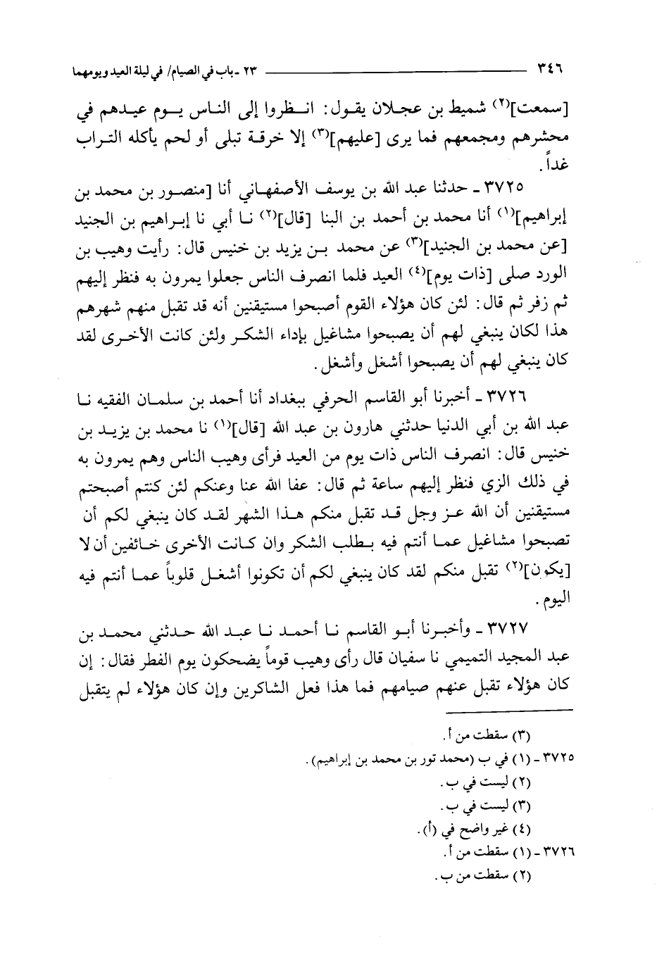 3727 - و أخبرنا أبو القاسم نا أحمد نا عبد الله حدثني محمد بن عبد المجيد التميمي نا سفيان قال رأى وهيب قوما يضحكون يوم الفطر فقال : إن كان هؤلاء تقبل عنهم صيامهم فما هذا فعل الشاكرين و إن كان هؤلاء لم يتقبل منهم صيامهم فما هذا فعل الخائفين