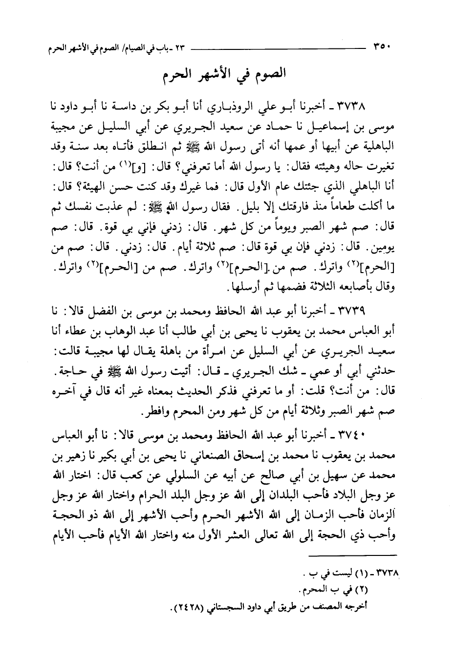 3738 - أخبرنا أبو علي الروذباري أنا أبو بكر بن داسة نا أبو داود نا موسى بن إسماعيل نا حماد عن سعيد الجريري عن أبي السليل عن مجيبة الباهلية عن أبيها أو عمها : أنه أتى رسول الله صلى الله عليه و سلم ثم انطلق فأتاه بعد سنة و قد تغيرت حاله و هيئته فقال : يا رسول الله أما تعرفني ؟ قال : و من أنت ؟ قال : أنا الباهلي الذي جئتك عام الأول قال : فما غيرك و قد كنت حسن الهيئة ؟ قال : ما أكلت طعاما منذ فارقتك إلا بليل فقال رسول الله صلى الله عليه و سلم : لم عذيت نفسك ثم قال : صم شهر الصبر و يوما من كل شهر قال : زدني فإني بي قوة قال : صم يومين قال : زدني فإن بي قوة قال : صم ثلاثة أيام : زدني قال : صم من الحرم و اترك صم من الحرم و اترك صم من الحرم و اترك