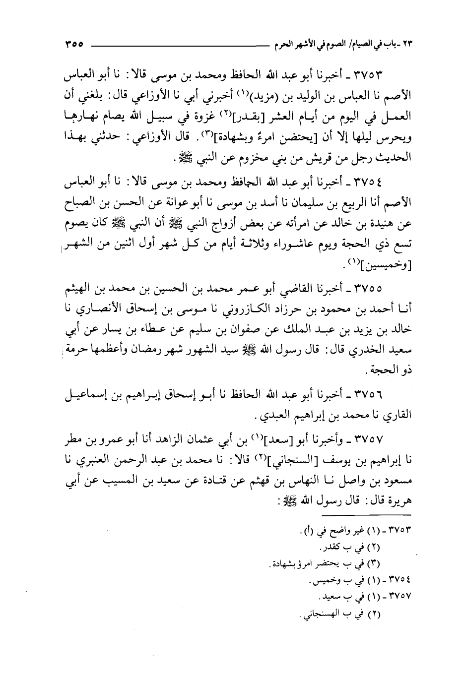 3754 - أخبرنا أبو عبد الله الحافظ و محمد بن موسى : نا أبو العباس الأصم أنا الربيع بن سليمان نا أسد بن موسى نا أبو عوانة عن الحسن بن الصباح عن هنيدة بن خالد عن امرأته عن بعض أزواج النبي صلى الله عليه و سلم : أن النبي صلى الله عليه و سلم كان يصوم تسع ذي الحجة و يوم عاشوراء و ثلاثة أيام من كل شهر أول اثنين من الشهر و خميسين