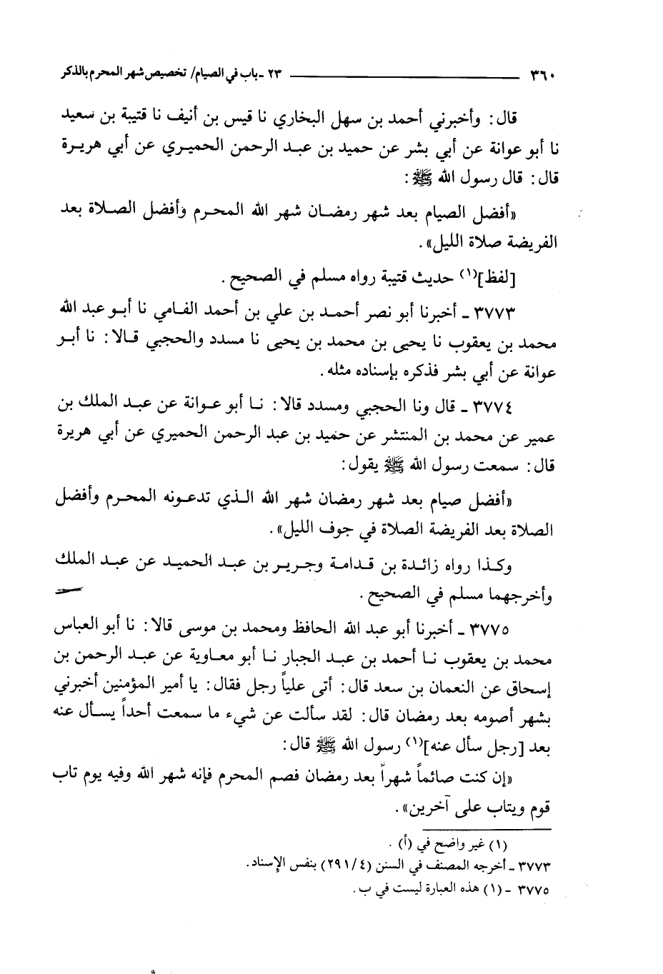 3773 - أخبرنا أبو نصر أحمد بن علي بن أحمد الفامي نا أبو عبد الله محمد بن يعقوب نا يحيى بن محمد بن يحيى نا مسدد و الحجبي قالا : نا أبو عوانة عن أبي بشر : فذكره بإسناده مثله
