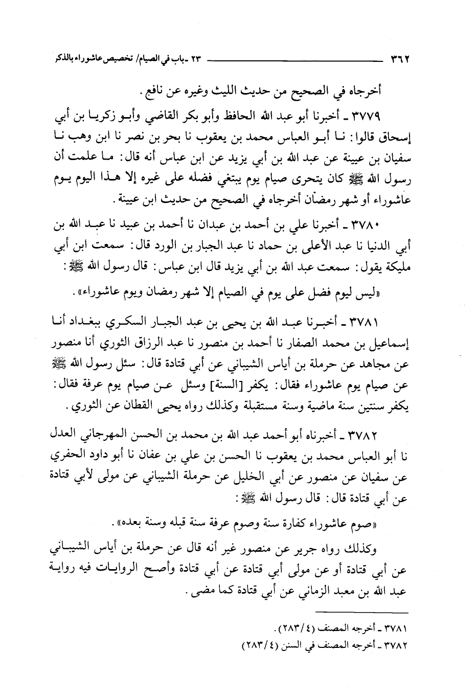 3779 - أخبرنا أبو عبد الله الحافظ و أبو بكر القاضي و أبو زكريا بن أبي إسحاق قالوا : نا أبو العباس محمد بن يعقوب نا بحر بن نصر نا ابن وهب نا سفيان بن عيينة عن عبد الله بن أبي يزيد عن ابن عباس أنه قال : ما علمت أن رسول الله صلى الله عليه و سلم كان يتحرى صيام يوم يبتغي فضله على غيره إلا هذا اليوم يوم عاشوراء أو شهر رمضان أخرجاه في الصحيح من حديث ابن عيينة