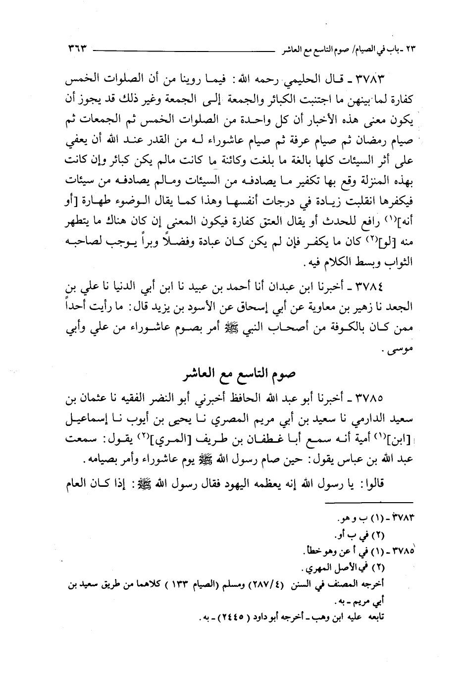 3784 - أخبرنا ابن عبدان أنا أحمد بن عبيد نا ابن أبي الدنيا نا علي بن الجعد نا زهير بن معاوية عن أبي إسحاق عن الأسود بن يزيد قال : ما رأيت أحدا ممن كان بالكوفة من أصحاب النبي صلى الله عليه و سلم أمر بصوم عاشوراء من علي و أبي موسى