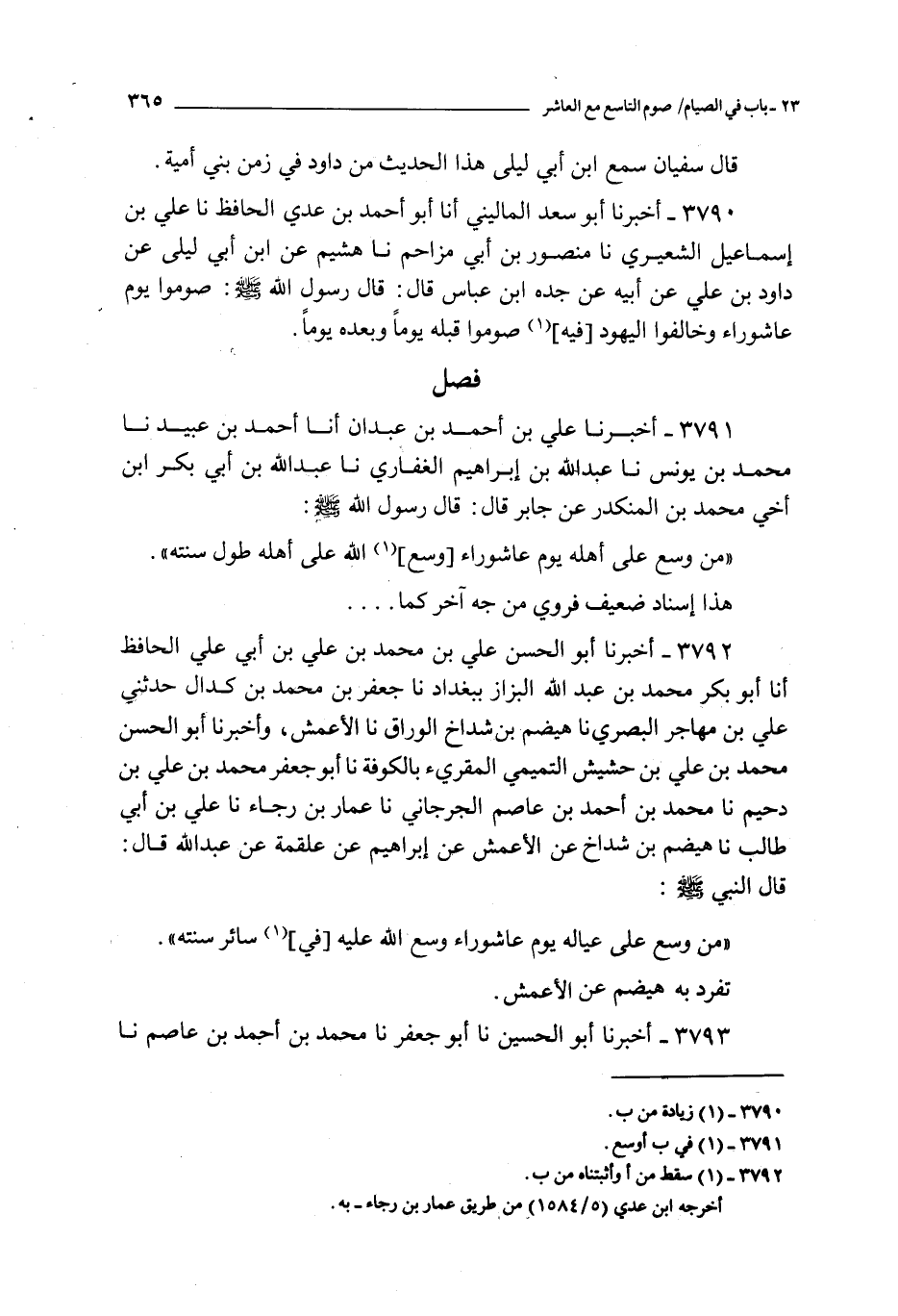 3790 - أخبرنا أبو سعد الماليني أنا أبو أحمد بن عدي الحافظ نا علي بن إسماعيل الشعيري نا منصور بن أبي مزاحم نا هشيم عن ابن أبي ليلى عن داود بن علي عن أبيه عن جده ابن عباس قال : قال رسول الله صلى الله عليه و سلم : صوموا قبله يوما و بعده يوما