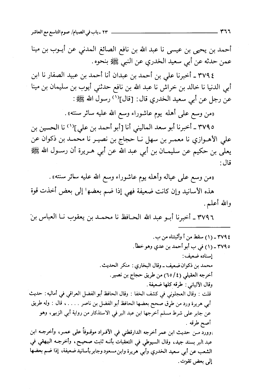 3796 - أخبرنا أبو عبد الله الحافظ نا محمد بن يعقوب نا العباس بن محمد المروزي نا شاذان أنا جعفر الأحمر عن إبراهيم بن محمد بن المنتشر قال : كان يقال من وسع على عياله يوم عاشوراء لم يزالوا في سعة من رزقهم سائر سنتهم و أما الاكتحال فإنما روي في ذلك بإسناده ضعيف بمرة
