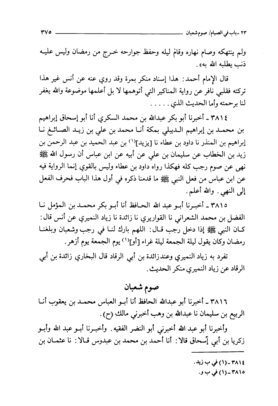 3815 - أخبرنا أبو عبد الله الحافظ أنا أبو بكر محمد بن المؤمل نا الفضل بن محمد الشعراني نا القواريري نا زائدة نا زياد النميري عن أنس قال : كان النبي صلى الله عليه و سلم إذا دخل رجب قال : اللهم بارك لنا في رجب و شعبان و بلغنا رمضان و كان يقول ليلة الجمعة ليلة غراء أو يوم الجمعة يوم أزهر