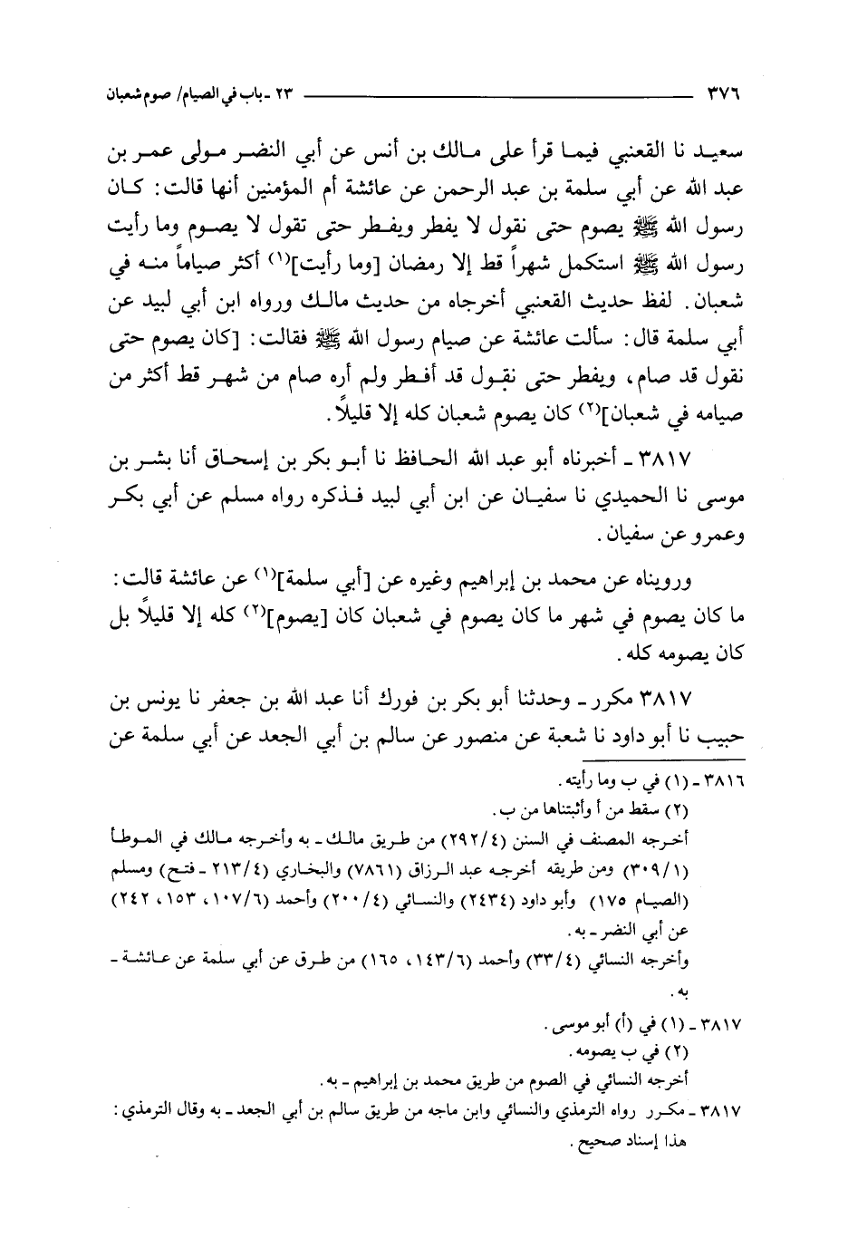 و رويناه عن محمد بن إبراهيم و غيره عن أبي سلمة عن عائشة قالت : ما كان يصوم في شهر ما كان يصوم في شعبان كان يصوم كله إلا قليلا بل كان يصومه كله