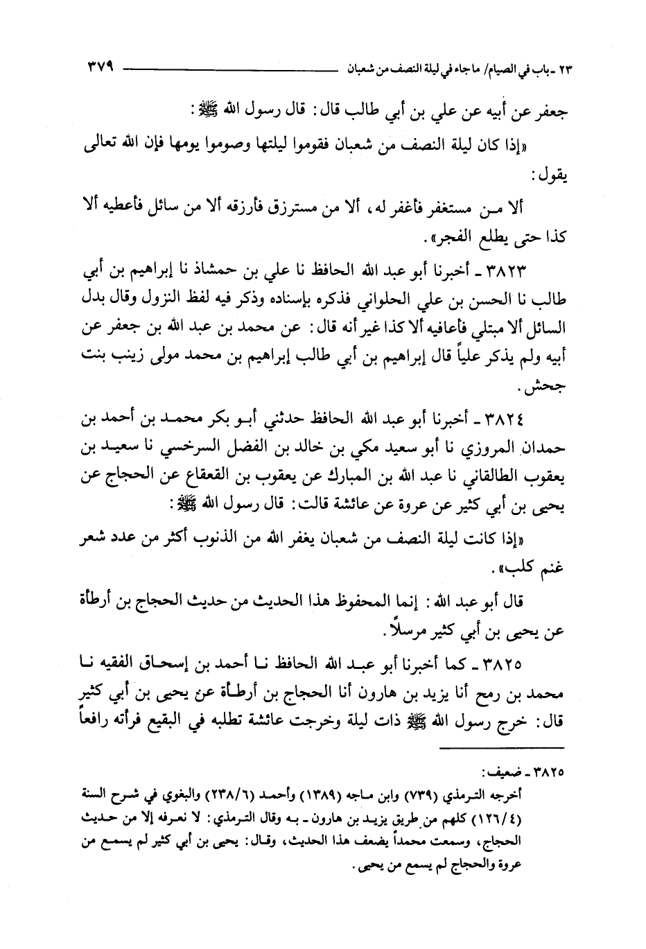 3825 - كما أخبرنا أبو عبد الله الحافظ نا أحمد بن إسحاق الفقيه نا محمد بن رمح أنا يزيد بن هارون أنا الحجاج بن أرطأة عن يحيى بن أبي كثير قال : خرج رسول الله صلى الله عليه و سلم ذات ليلة و خرجت عائشة تطلبه في البقيع فرأته رافعا رأسه إلى السماء فقال : أكنت تخافين أن يحيف الله عليك و رسوله قالت : قلت يا رسول الله ظننت أنك أتيت بعض نسائك فقال : إن الله يغفر ليلة النصف من شعبان لأكثر من عدد شعر غنم كلب و لهذا الحديث شواهد من حديث عائشة و أبي بكر الصديق و أبي موسى الأشعري و استثنى في بعضها المشرك و المشاحن و في بعضها المشرك و قاطع الطريق و العاق و المشاحن و قد رواه محمد بن مسلمة الواسطي عن يزيد بن هارون موصولا كما