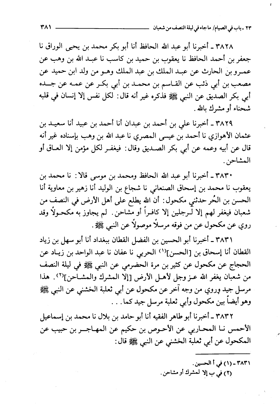3831 - أخبرنا أبو الحسين بن الفضل القطان ببغداد أنا أبو سهل بن زياد القطان أنا إسحاق بن الحسن الحربي نا عفان نا عبد الواحد بن زياد عن الحجاج عن مكحول عن كثير بن مرة الحضرمي : عن النبي صلى الله عليه و سلم في ليلة النصف من شعبان يغفر الله عز و جل لأهل الأرض إلا المشرك و المشاحن هذا مرسل جيد و روي من وجه آخر عن مكحول عن أبي ثعلبة الخشني عن النبي صلى الله عليه و سلم و هو أيضا بين مكحول و أبي ثعلبة مرسل جيد كما