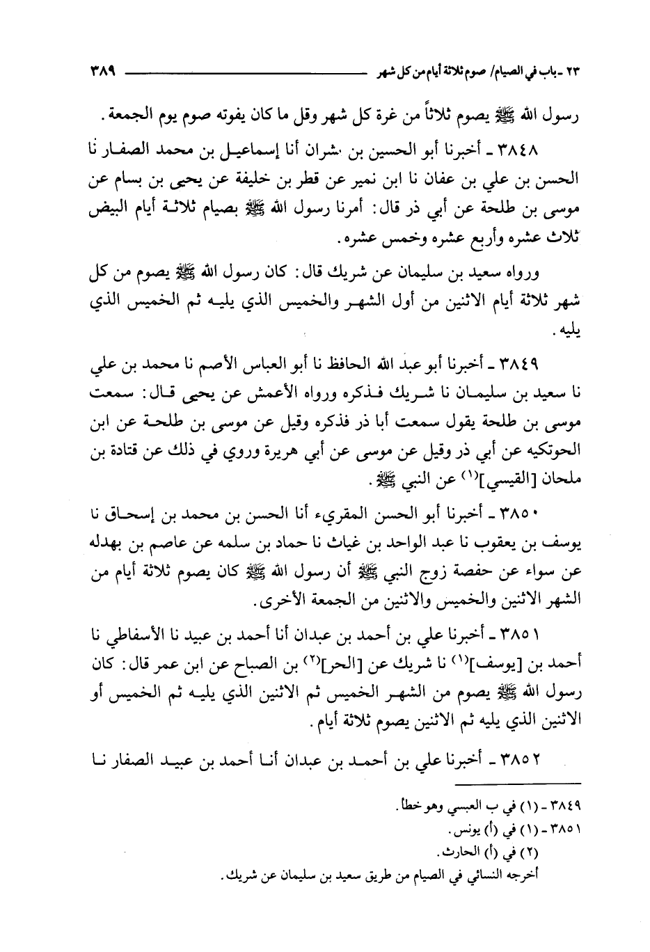 3851 - أخبرنا علي بن أحمد بن عبدان أنا أحمد بن عبيد نا الأسفاطي نا أحمد بن يوسف نا شريك عن الحر بن الصباح عن ابن عمر قال : كان رسول الله صلى الله عليه و سلم يصوم من الشهر الخميس ثم الاثنين الذي يليه ثم الخميس أو الاثنين الذي يليه ثم الاثنين يصوم ثلاثة أيام