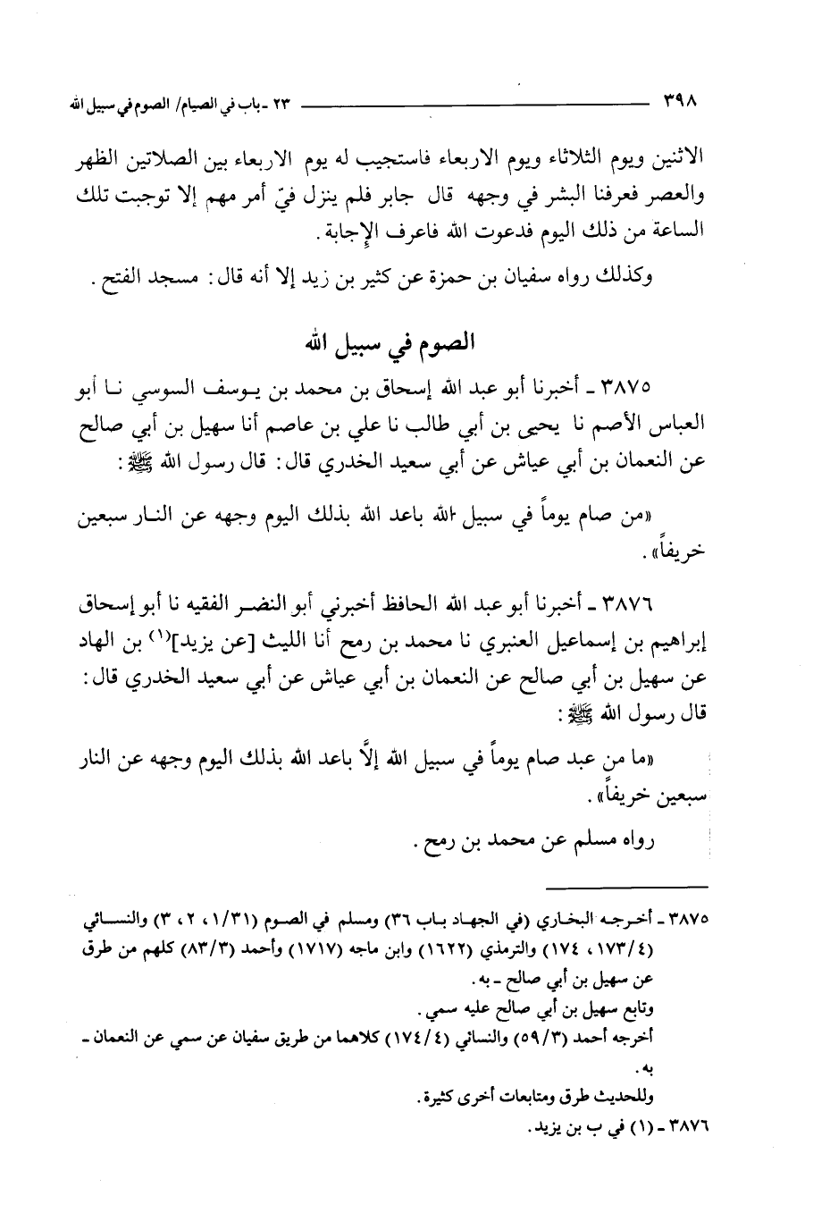 3876 - أخبرنا أبو عبد الله الحافظ أخبرني أبو النضر الفقيه نا أبو إسحاق إبراهيم بن إسماعيل العنبري نا محمد بن رمح أنا الليث عن يزيد بن الهاد عن سهيل بن أبي صالح عن النعمان بن أبي عياش عن أبي سعيد الخدري قال : قال رسول الله صلى الله عليه و سلم :