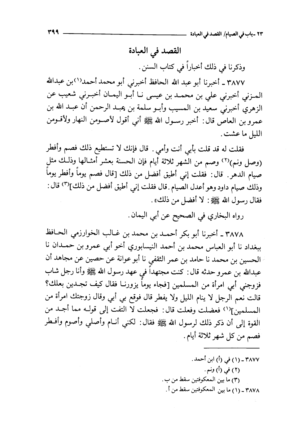 3878 - أخبرنا أبو بكر أحمد بن محمد بن غالب الخوارزمي الحافظ ببغداد نا أبو العباس محمد بن أحمد النيسابوري أخو أبي عمرو بن حمدان نا الحسين بن محمد نا حامد بن عمر الثقفي نا أبو عوانة عن حصين عن مجاهد أن عبد الله بن عمرو حدثه قال : كنت مجتهدا في عهد رسول الله صلى الله عليه و سلم و أنا رجل شاب فزوجني أبي امرأة من المسلمين فجاء يوما يزورنا فقال كيف تجدين بعلك ؟ قالت نعم الرجل لا ينام الليل و لا يفطر قال فوقع بي أبي و قال زوجتك امرأة من المسلمين فعضلت و فعلت قال : فجعلت لا التفت إلى قوله مما أجد من القوة إلى أن ذكر ذلك لرسول الله صلى الله عليه و سلم فقال : لكني أنام و أصلي و أصوم و أفطر فصم من كل شهر ثلاثة أيام