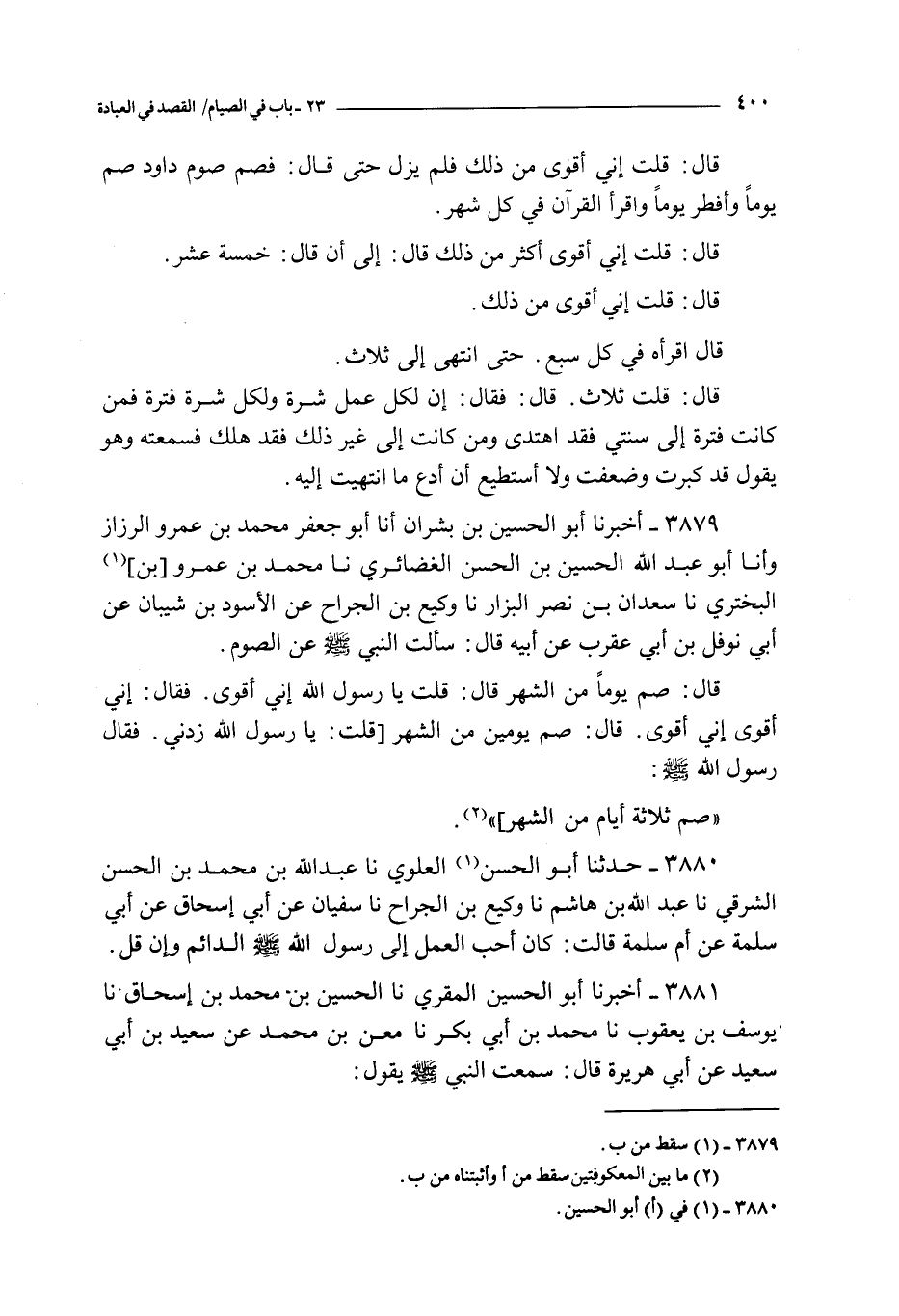 3880 - حدثنا أبو الحسن العلوي نا عبد الله بن محمد بن الحسن الشرقي نا عبد الله بن هاشم نا وكيع بن الجراح نا سفيان عن أبي إسحاق عن أبي سلمة عن أم سلمة قالت : كان أحب العمل إلى رسول الله صلى الله عليه و سلم الدائم و إن قل
