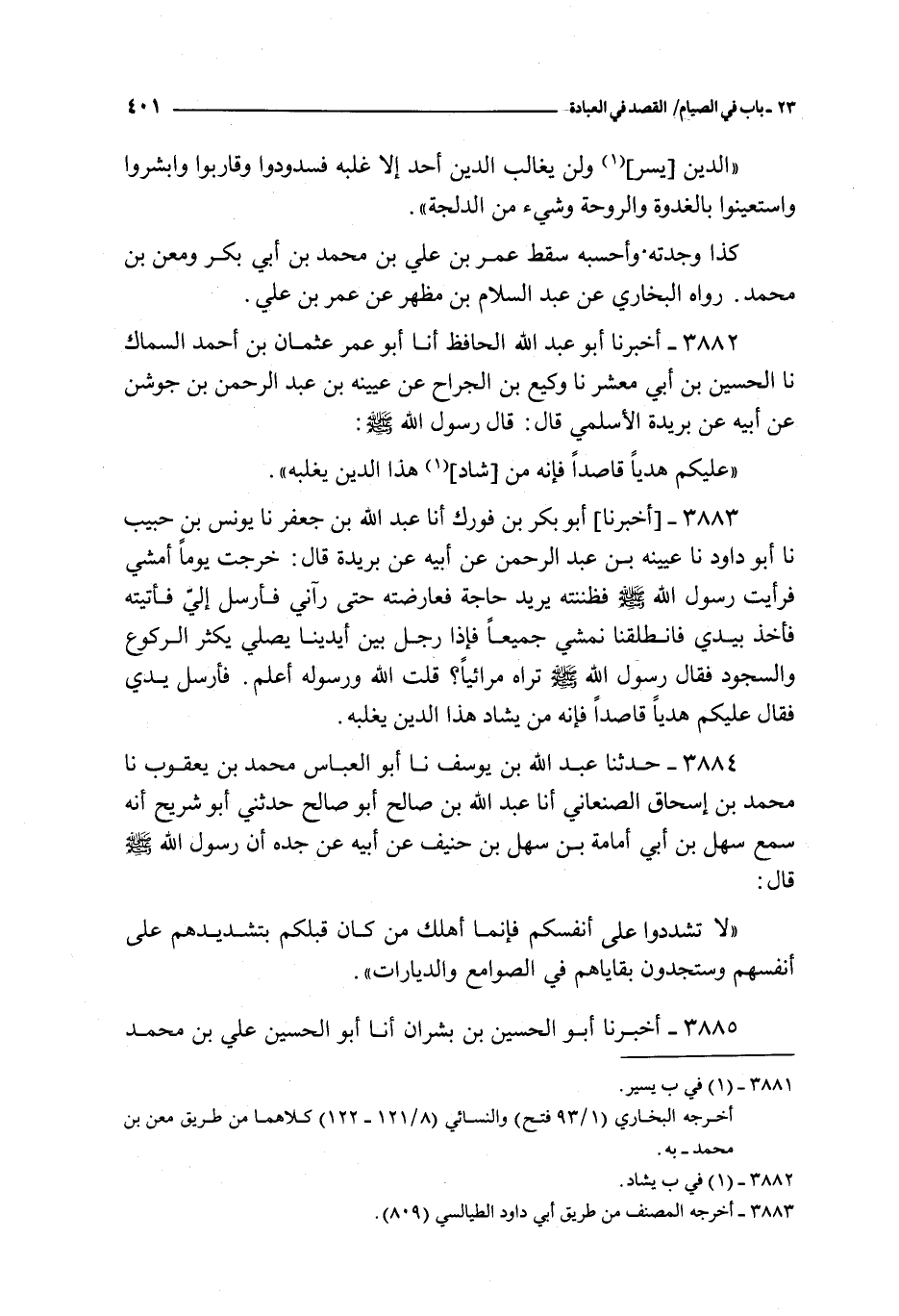 3883 - أخبرنا أبو بكر بن فورك أنا عبد الله بن جعفر نا يونس بن حبيب نا أبو داود نا عيينه بن عبد الرحمن عن أبيه عن بريدة قال : خرجت يوما أمشي فرأيت رسول الله صلى الله عليه و سلم فظننته يريد حاجة فعارضته حتى رآني فأرسل إلي فأتيته فأخذ بيدي فانطلقنا نمشي جميعا فإذا رجل بين أيدينا يصلي يكثر الركوع و السجود فقال رسول الله صلى الله عليه و سلم تراه مرائيا ؟ قلت الله و رسوله أعلم فأرسل يدي فقال عليكم هديا قاصدا فإنه من يشاد هذا الدين يغلبه