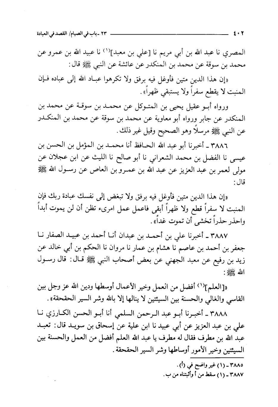 3888 - أخبرنا أبو عبد الرحمن السلمي أنا أبو الحسن الكارزي نا علي بن عبد العزيز عن أبي عبيد نا ابن علية عن إسحاق بن سويد قال : تعبد عبد الله بن مطرف فقال له مطرف يا عبد الله العلم أفضل من العمل و الحسنة بين السيئتين و خير الأمور أوساطها و شر السير الحقحقة