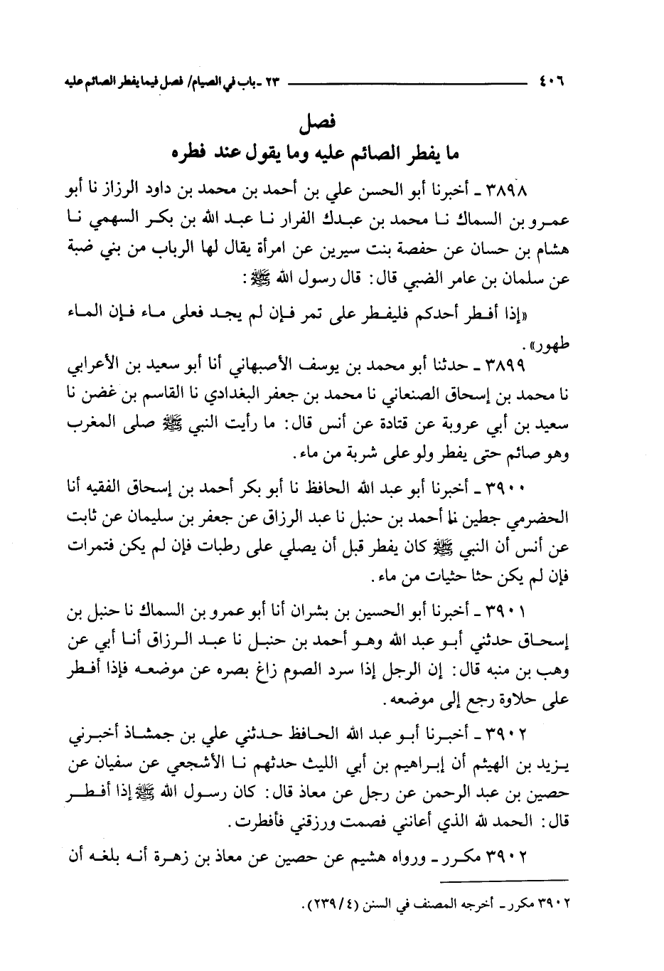 3901 - أخبرنا أبو الحسين بن بشران أنا أبو عمرو بن السماك نا حنبل بن إسحاق حدثني أبو عبد الله و هو أحمد بن حنبل نا عبد الرزاق أنا أبي عن وهب بن منبه قال : إن الرجل إذا سرد الصوم زاغ بصره عن موضع فإذا أفطر على حلاوة رجع إلى موضعه