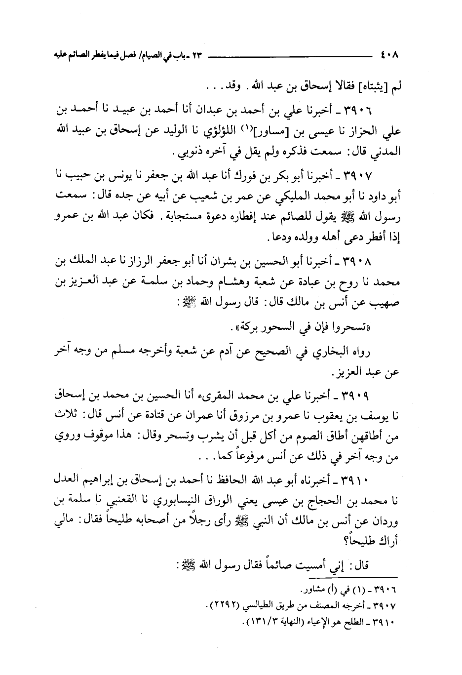 3909 - أخبرنا علي بن محمد المقرىء أنا الحسين بن محمد بن إسحاق نا يوسف بن يعقوب نا عمرو بن مرزوق أنا عمران عن قتادة عن أنس قال : ثلاث من أطاقهن أطاق الصوم من أكل قبل أن يشرب و تسحر و قال : هذا موقوف و روي من وجه آخر في ذلك عن أنس مرفوعا كما