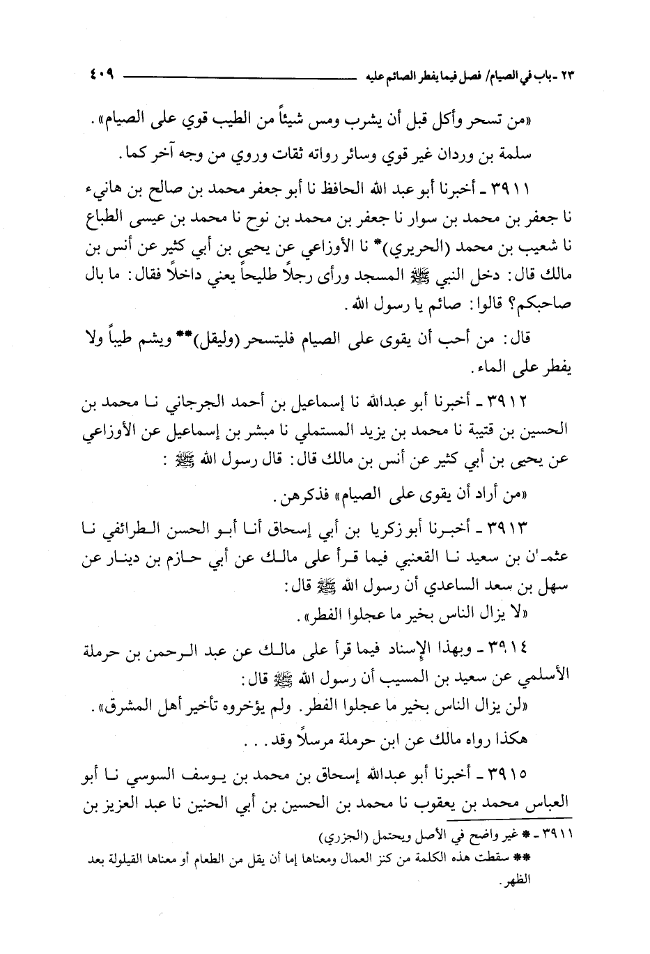 3913 - أخبرنا أبو زكريا بن أبي إسحاق أنا أبو الحسن الطرائفي نا عثمان بن سعيد نا القعنبي فيما قرأ على مالك عن أبي حازم بن دينار عن سهل بن سعد الساعدي : أن رسول الله صلى الله عليه و سلم قال :