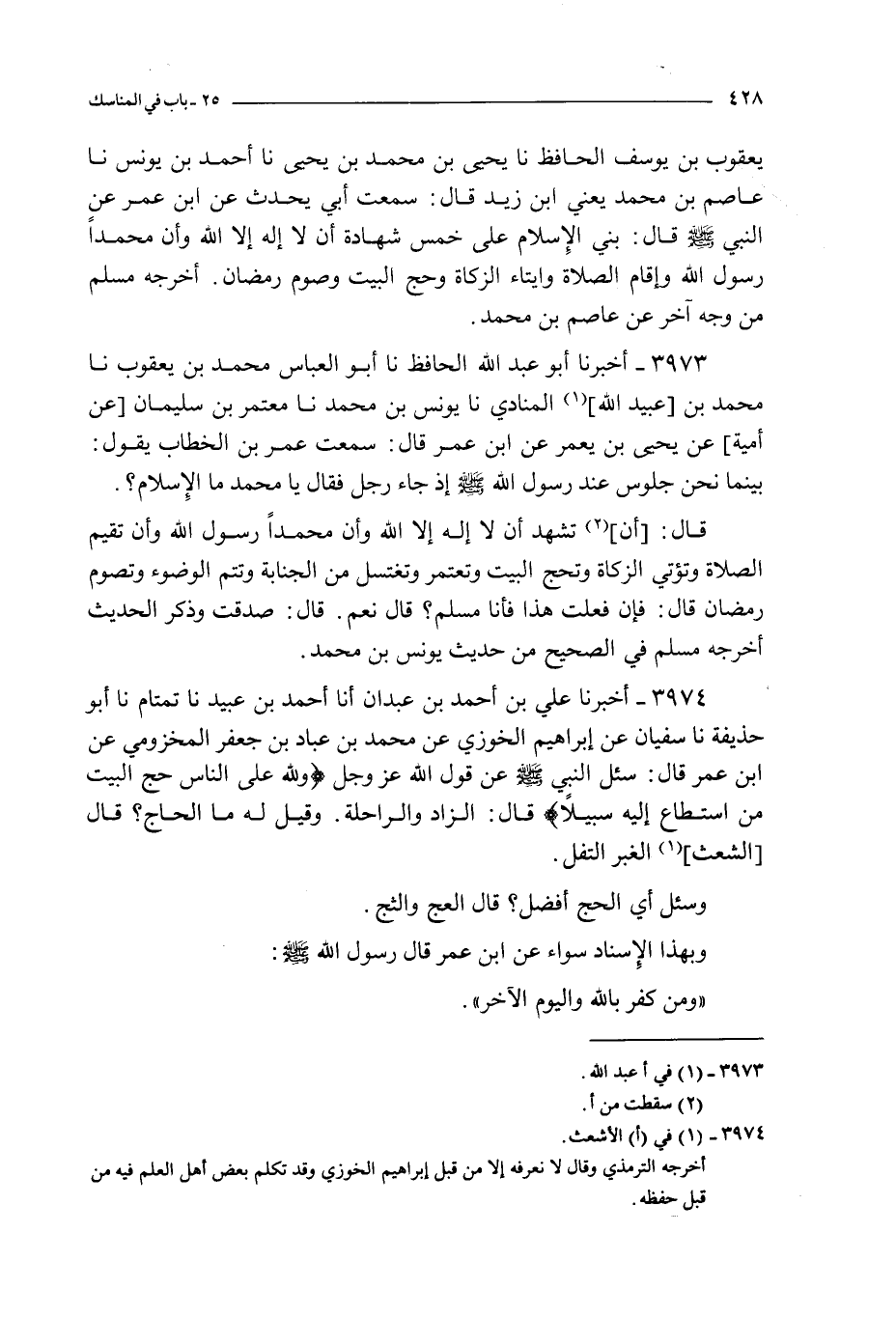 3973 - أخبرنا أبو عبد الله الحافظ نا أبو العباس محمد بن يعقوب نا محمد بن عبيد الله المنادي نا يونس بن محمد نا معتمر بن سليمان عن أمية عن يحيى بن يعمر عن ابن عمر قال : سمعت عمر بن الخطاب يقول : بينما نحن جلوس عند رسول الله صلى الله عليه و سلم إذ جاء رجل فقال يا محمد ما الإسلام ؟