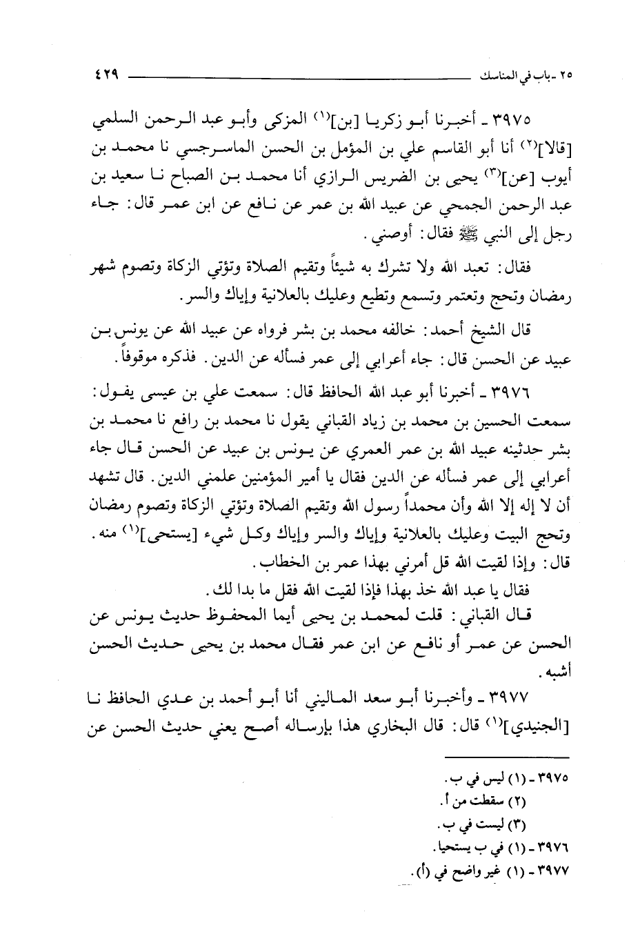 3976 - أخبرنا أبو عبد الله الحافظ قال : سمعت علي بن عيسى يقول : سمعت الحسين بن محمد بن زياد القباني يقول نا محمد بن رافع نا محمد بن بشر حدثنيه عبيد الله بن عمر العمري عن يونس بن عبيد عن الحسن قال : جاء أعرابي إلى عمر فسأله عن الدين فقال يا أمير المؤمنين علمني الدين قال تشهد أن لا إله إلا الله و أن محمدا رسول الله وتقيم الصلاة و تؤتي الزكاة و تصوم رمضان و تحج البيت و عليك بالعلانية و إياك و السر و إياك و كل شيء يستحى منه