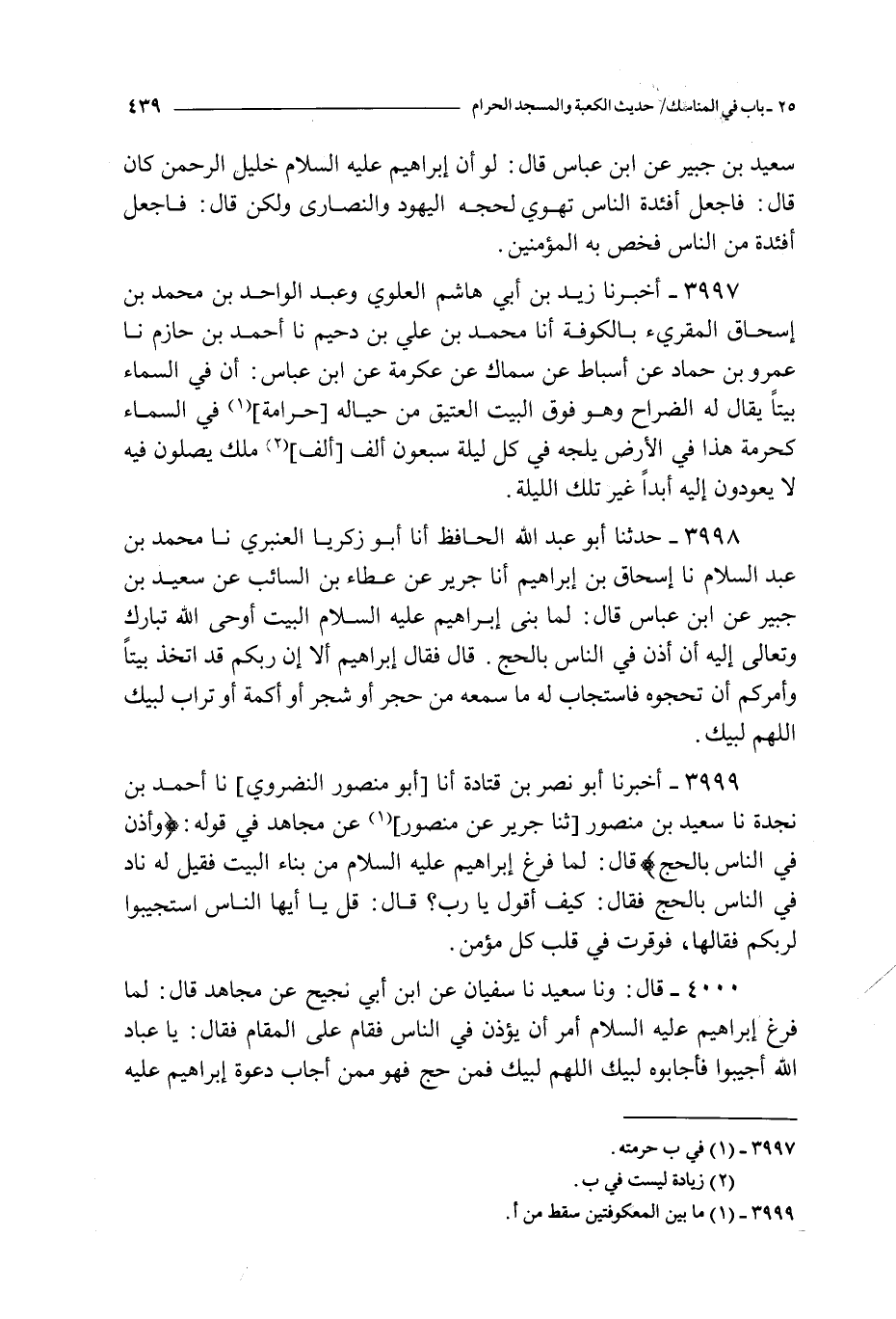 3999 - أخبرنا أبو نصر بن قتادة أنا أبو منصور النضروي نا أحمد بن نجدة نا سعيد بن منصور ثنا جرير عن منصور عن مجاهد : في قوله : { و أذن في الناس بالحج } قال : لما فرغ إبراهيم عليه السلام من بناء البيت فقيل له ناد في الناس بالحج فقال : كيف أقول يا رب ؟ قال : قل يا أيها الناس استجيبوا لربكم فقالها فوقرت في قلب كل مؤمن