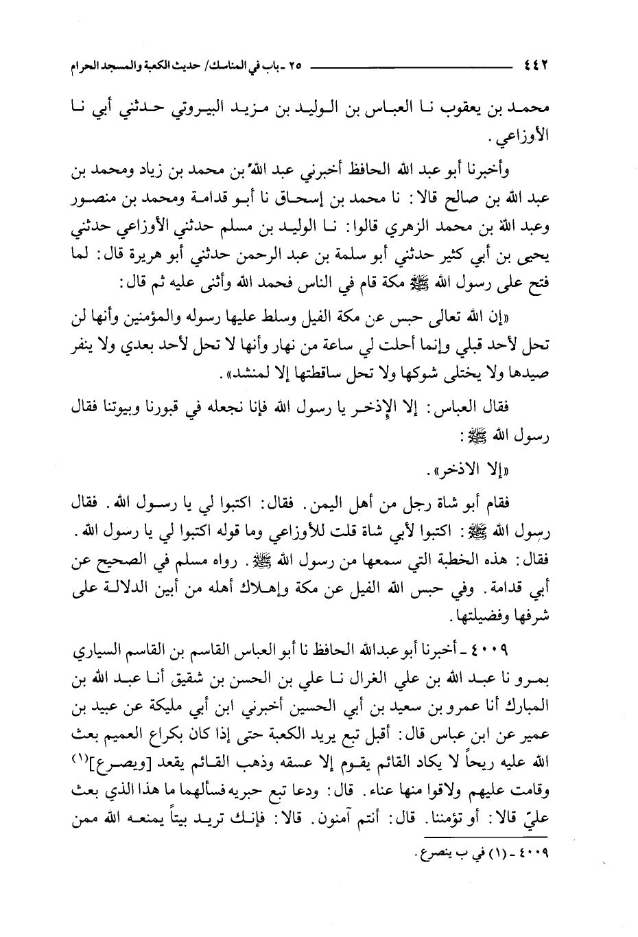 4009 - أخبرنا أبو عبد الله الحافظ نا أبو العباس القاسم بن القاسم السياري بمرو نا عبد الله بن علي الغرال نا علي بن الحسن بن شقيق أنا عبد الله بن المبارك أنا عمرو بن سعيد بن أبي الحسين أخبرني ابن أبي ملكية عن عبيد بن عمير عن ابن عباس قال : أقبل تبع يريد الكعبة حتى إذا كان بكراع العميم بعث الله عليه ريحا لا يكاد القائم يقوم إلا عسقه و ذهب القائم يقعد و يصرع و قامت عليهم و لاقوا منها عناء قال : و دعا تبع حبريه فسألهما ما هذا الذي بعث علي قالا : أو تؤمننا قال : أنتم آمنون قالا : فإنك تريد بيتا يمنعه الله ممن أراده قال : فما يذهب هذا عني قالا : تجرد في ثوبين ثم تقول : لبيك لبيك ثم تدخل فتطوف بذلك البيت و لا تهيج أحدا من أهله قال : فإن اجتمعت على هذا ذهبت هذه الريح عني قالا : نعم فتجرد ثم لبى قال ابن عباس : فأدبرت الريح كقطع الليل المظلم