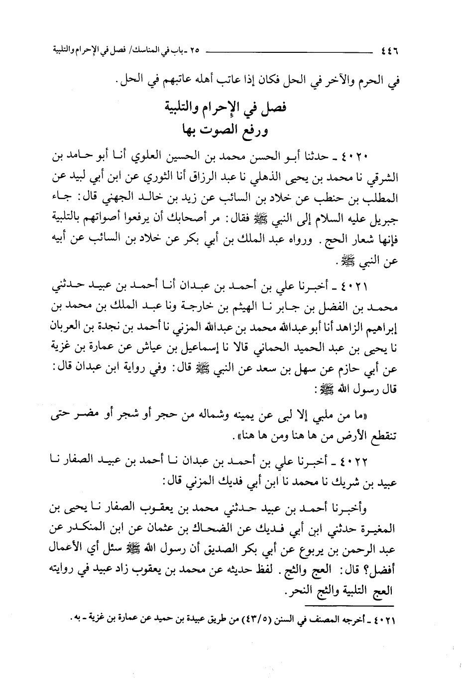 4020 - حدثنا أبو الحسن محمد بن الحسين العلوي أنا أبو حامد بن الشرقي نا محمد بن يحيى الذهلي نا عبد الرزاق أنا الثوري عن ابن أبي لبيد عن المطلب بن حنطب عن خلاد بن السائب عن زيد بن خالد الجهني قال : جاء جبريل عليه السلام إلى النبي صلى الله عليه و سلم فقال : مر أصحابك أن يرفعوا أصواتهم بالتلبية فإنها شعار الحج و رواه عبد الملك بن أبي بكر عن خلاد بن السائب عن أبيه عن النبي صلى الله عليه و سلم