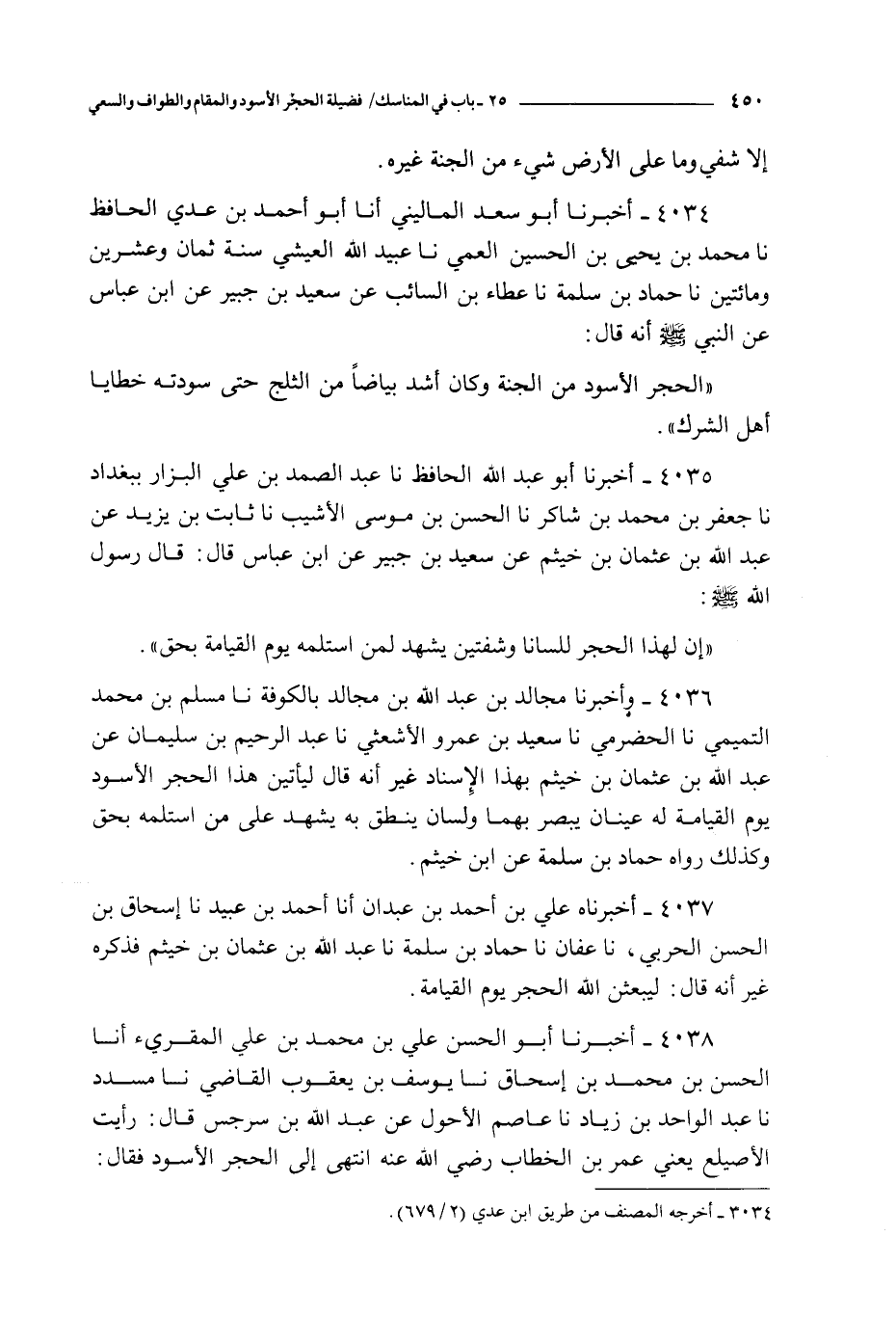 4036 - و أخبرنا مجالد بن عبد الله بن مجالد بالكوفة نا مسلم بن محمد التميمي نا الحضرمي نا سعيد بن عمرو الأشعثي نا عبد الرحيم بن سليمان عن عبد الله بن عثمان بن خيثم : بهذا الإسناد غير أنه قال : ليأتين هذا الحجر الأسود يوم القيامة له عينان يبصر بهما و لسان ينطق به يشهد على من استلمه بحق و كذلك رواه حماد بن سلم عن ابن خيثم
