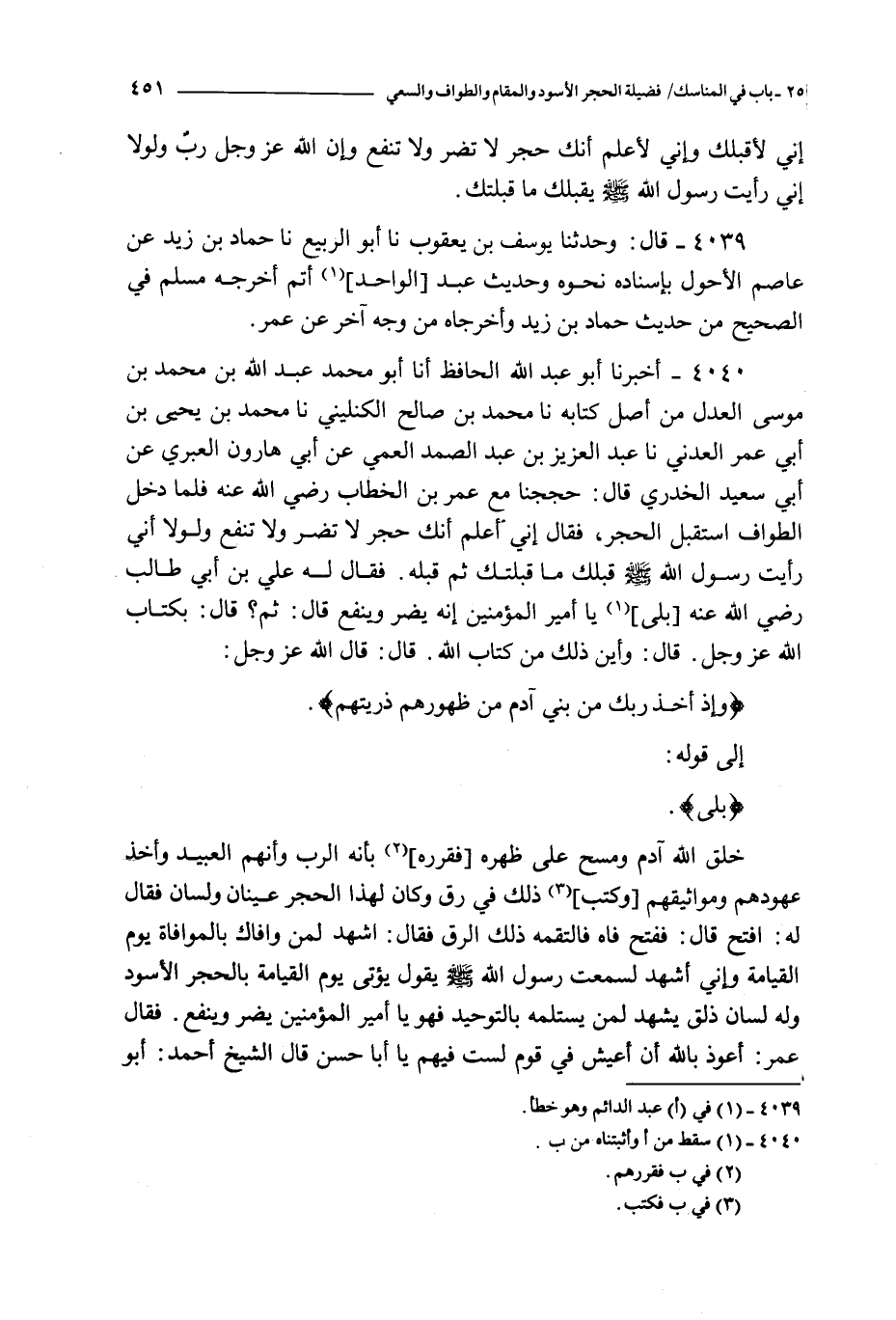 خلق الله آدم و مسح على ظهره فقرره بأنه الرب و أنهم العبيد و أخذ عهودهم و مواثيقهم و كتب ذلك في رق و كان لهذا الحجر عينان و لسان فقال له : افتح قال : ففتح فاه فالتقمه ذلك الرق فقال : اشهد لمن وافاك بالموافاة يوم القيامة و إني أشهد لسمعت رسول الله صلى الله عليه و سلم يقول يؤتى يوم القيامة بالحجر الأسود و له لسان ذلق يشهد لمن يستلمه بالتوحيد فهو يا أمير المؤمنين يضر و ينفع فقال عمر : أعوذ بالله أن أعيش في قوم لست فيهم يا أبا حسن قال الشيخ أحمد : أبو هارون العبدي غير قوي فإن صح فأمير المؤمنين عمر رضي الله عنه كان قد عبد الحجر فحين أهوى إلى الركن كأنه هاب ما كان عليه في الجاهلية فتبرأ من كل شيء سوى الله و أخبره بأنه حجر لا يضر و لا ينفع يريد ما كان على هيئته حجرا و إنه يقبله متابعة للسنة و قول أمير المؤمنين علي أنه يضر و ينفع يريد به إذا خلق الله تعالى فيه حياة وأذن له في الشهادة و ذلك أنه يعلم بخبر الرسول صلى الله عليه و سلم وكان عنده في ذلك خبر فأخبر به فقبله عمر رضي الله عنهما