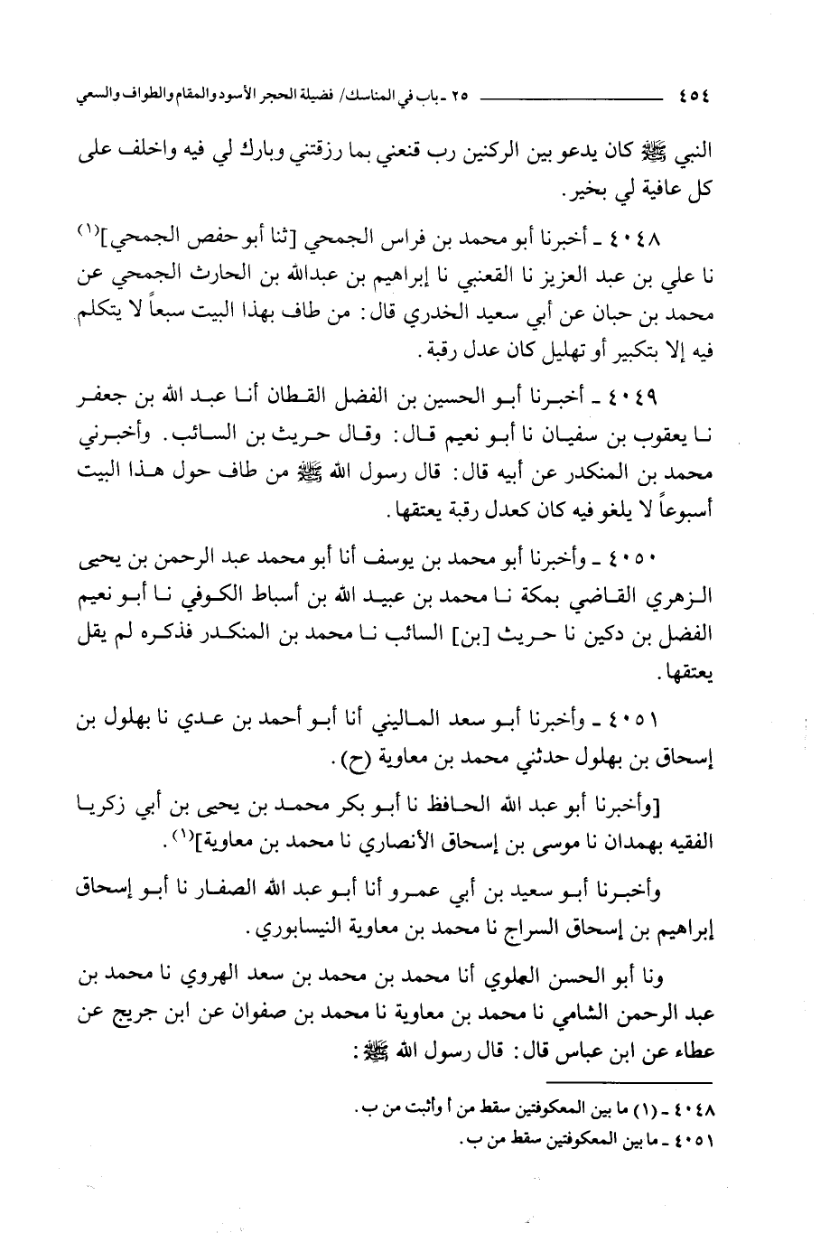 4049 - أخبرنا أبو الحسين بن الفضل القطان أنا عبد الله بن جعفر نا يعقوب بن سفيان نا أبو نعيم قال : و قال حريث بن السائب و أخبرني محمد بن المنكدر عن أبيه قال : قال رسول الله صلى الله عليه و سلم من طاف حول هذا البيت أسبوعا لا يلغو فيه كان كعدل رقبة يعتقها