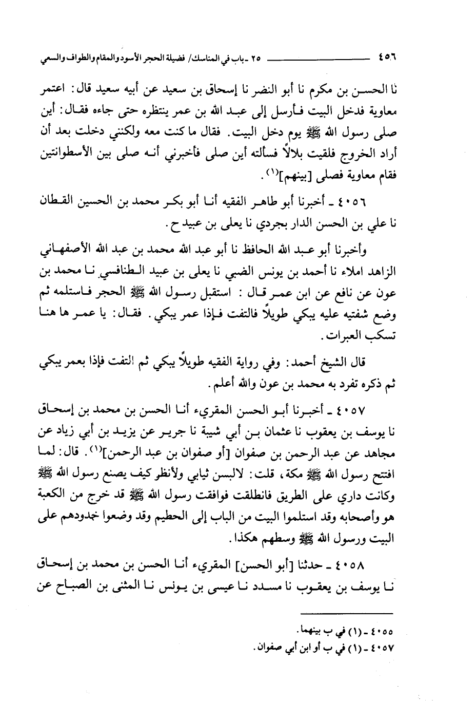 و أخبرنا أبو عبد الله الحافظ نا أبو عبد الله محمد بن عبد الله الأصفهاني الزاهد إملاء نا أحمد بن يونس الضبي نا يعلى بن عبيد الطنافسي نا محمد بن عون عن نافع عن ابن عمر قال : استقبل رسول الله صلى الله عليه و سلم الحجر فاستلمه ثم وضع شفتيه عليه يبكي طويلا فالتفت فإذا عمر يبكي فقال : يا عمر ها هنا تسكب العبرات