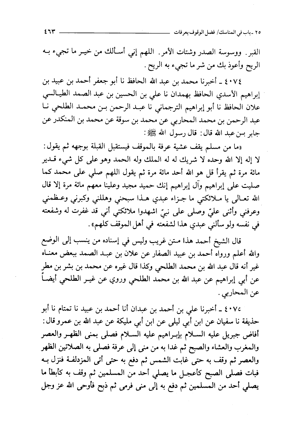 4075 - أخبرنا علي بن أحمد بن عبدان أنا أحمد بن عبيد نا تمتام نا أبو حذيفة نا سفيان عن ابن أبي ليلى عن ابن أبي ملكية عن عبد الله بن عمرو قال : أفاض جبريل عليه السلام بإبراهيم عليه السلام فصلى بمنى الظهر و العصر و المغرب و العشاء و الصبح ثم غدا به من منى إلى عرفة فصلى به الصلاتين الظهر و العصر ثم وقف به حتى غابت الشمس ثم دفع به حتى أتى المزدلفة فنزل به فبات فصلى الصبح كأعجل ما يصلي أحد من المسلمين ثم وقف به كأبطأ ما يصلي أحد من المسلمين ثم دفع به إلى منى فرمى ثم ذبح فأوحى الله عز و جل إلى محمد صلى الله عليه و سلم { ثم أوحينا إليك أن اتبع ملة إبراهيم حنيفا و ما كان من المشركين }