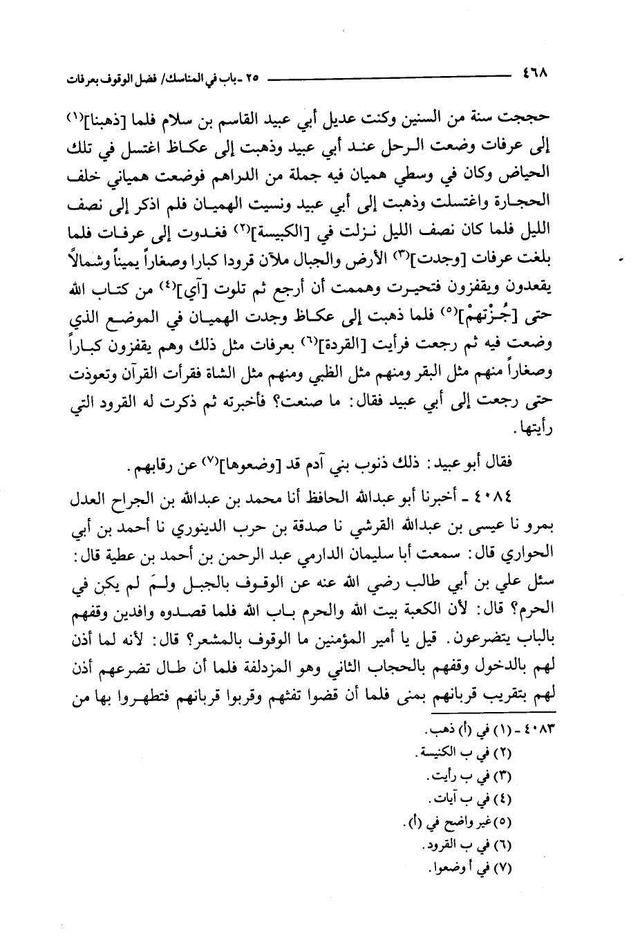4084 - أخبرنا أبو عبد الله الحافظ أنا محمد بن عبد الله بن الجراح العدل بمرو نا عيسى بن عبد الله القرشي نا صدقة بن حرب الدينوري نا أحمد بن أبي الحواري قال : سمعت أبا سليمان الدارمي عبد الرحمن بن أحمد بن عطية قال : سئل علي بن أبي طالب رضي الله عنه عن الوقوف بالجبل و لم لم يكن في الحرم ؟ قال : لأن الكعبة بيت الله و الحرم باب الله فلما قصدوه وافدين وقفهم بالباب يتضرعون قيل يا أمير المؤمنين ما الوقوف بالمشعر ؟ قال : لأنه لما أذن لهم بالدخول وقفهم بالحجاب الثاني و هو المزدلفة فلما أن طال تضرعهم أذن لهم بتقريب قربانهم بمنى فلما أن قضوا تفثهم و قربوا قربانهم فتطهروا بها من الذنوب التي كانت لهم أذن لهم بالوفادة إليه على الطهارة قيل : يا أمير المؤمنين فمن أين حرم صيام أيام التشريق ؟ قال : لأن القوم زوار الله و هم في ضيافته و لا يجوز للضيف أن يصوم دون إذن من أضافه