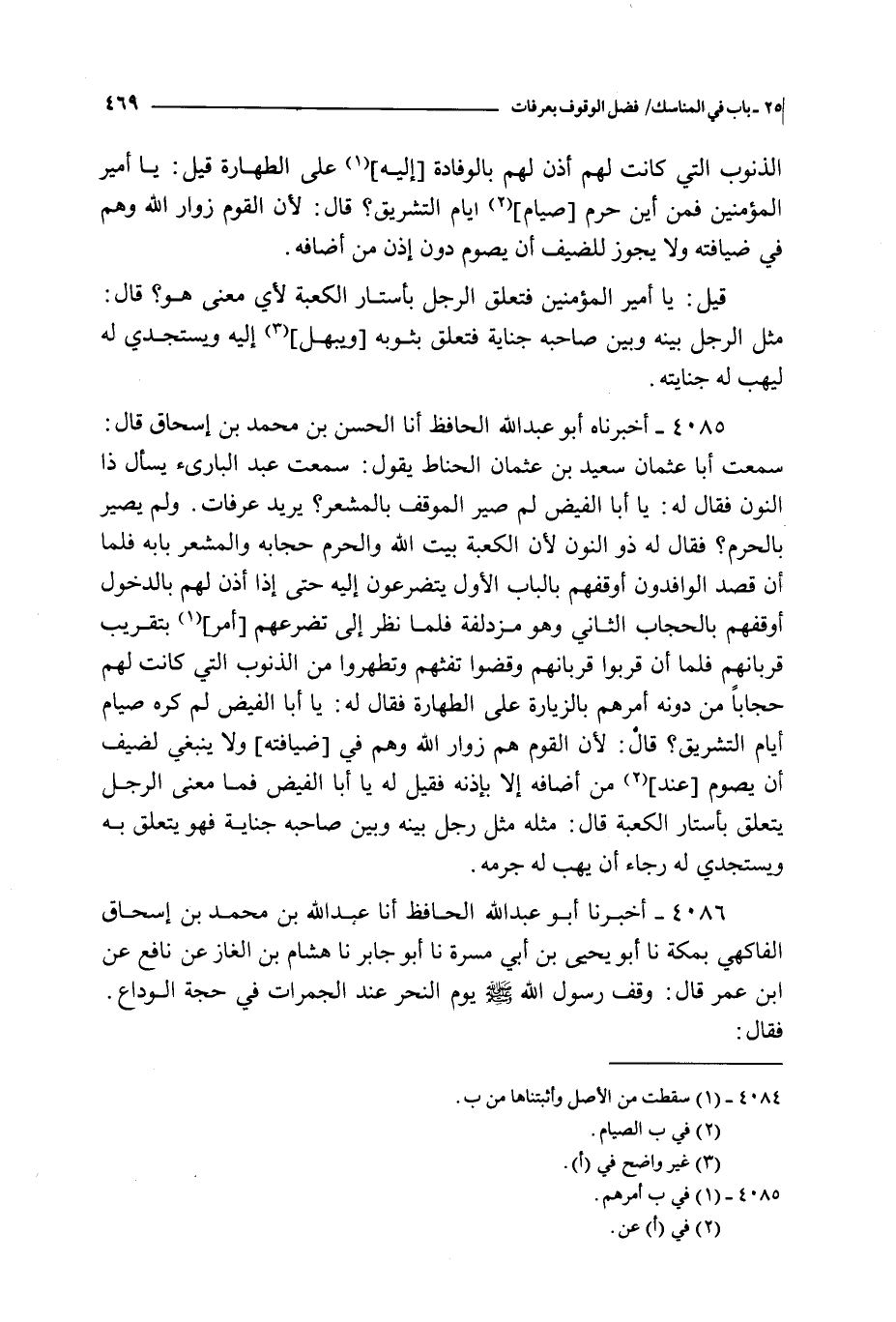 4085 - أخبرناه أبو عبد الله الحافظ أنا الحسن بن محمد بن إسحاق قال : سمعت أبا عثمان سعيد بن عثمان الحناط يقول : سمعت عبد البارىء يسأل ذا النون فقال له : يا أبا الفيض لم صير الموقف بالمشعر ؟ يريد عرفات و لم يصير بالحرم ؟ فقال له ذو النون لأن الكعبة بيت الله و الحرم حجابه و المشعر بابه فلما أن قصد الوافدون أوقفهم بالباب الأول يتضرعون إليه حتى إذا أذن لهم بالدخول أوقفهم بالحجاب الثاني و هو مزدلفة فلما نظر إلى تضرعهم أمر بتقريب قربانهم فلما أن قربوا قربانهم و قضوا تفثهم و تطهروا من الذنوب التي كانت لهم حجابا من دونه أمرهم بالزيارة على الطهارة فقال له : يا أبا الفيض لم كره صيام أيام التشريق ؟ قال : لأن القوم هم زوار الله و هم في ضيافته و لا ينبغي لضيف أن يصوم عند من أضافه إلا بإذنه فقيل له يا أبا الفيض فما معنى الرجل يتعلق بأستار الكعبة قال : مثله مثل رجل بينه و بين صاحبه جنابة فهو يتعلق به و يستجدي له رجاء أن يهب له جرمه