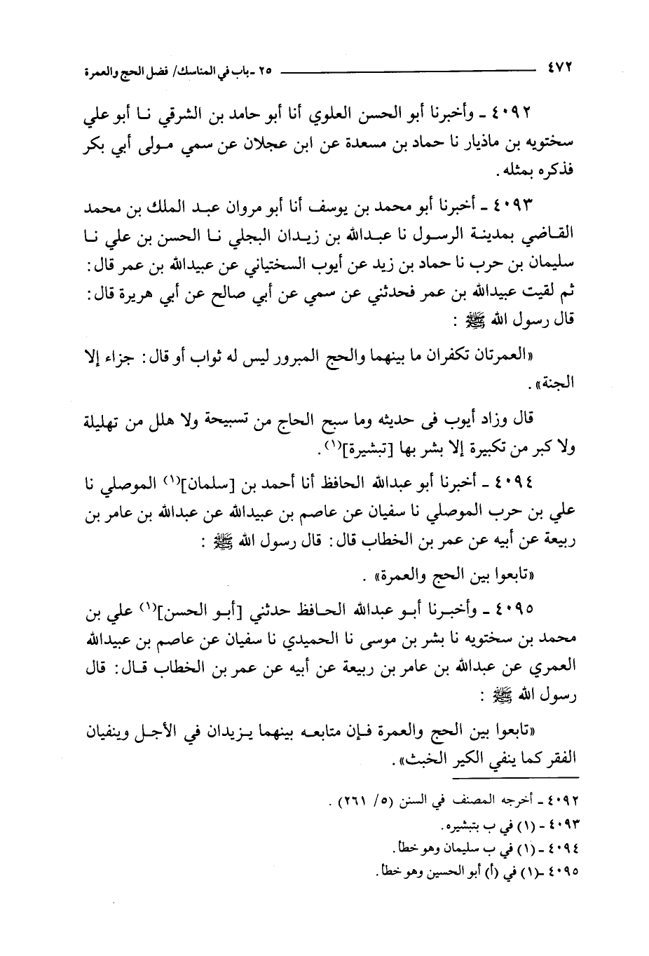 4093 - أخبرنا أبو محمد بن يوسف أنا أبو مروان عبد الملك بن محمد القاضي بمدينة الرسول نا عبد الله بن زيدان البجلي نا الحسن بن علي نا سليمان بن حرب نا حماد بن زيد عن أيوب السختياني عن عبيد الله بن عمر قال : ثم لقيت عبيد الله بن عمر فحدثني عن سمي عن أبي صالح عن أبي هريرة قال : قال رسول الله صلى الله عليه و سلم :