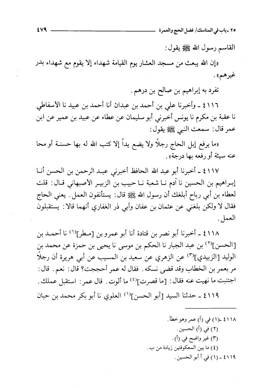 4117 - أخبرنا أبو عبد الله الحافظ أخبرني عبد الرحمن بن الحسن أنا إبراهيم بن الحسين نا آدم نا شعبة نا حبيب بن الزبير الأصبهاني قال : قلت لعطاء بن أبي رباح أبلغك أن رسول الله صلى الله عليه و سلم قال : يستأنفون العمل يعني الحاج فقال لا و لكن بلغني عن عثمان بن عفان و أبي ذر الغفاري أنهما قالا : يستقبلون العمل