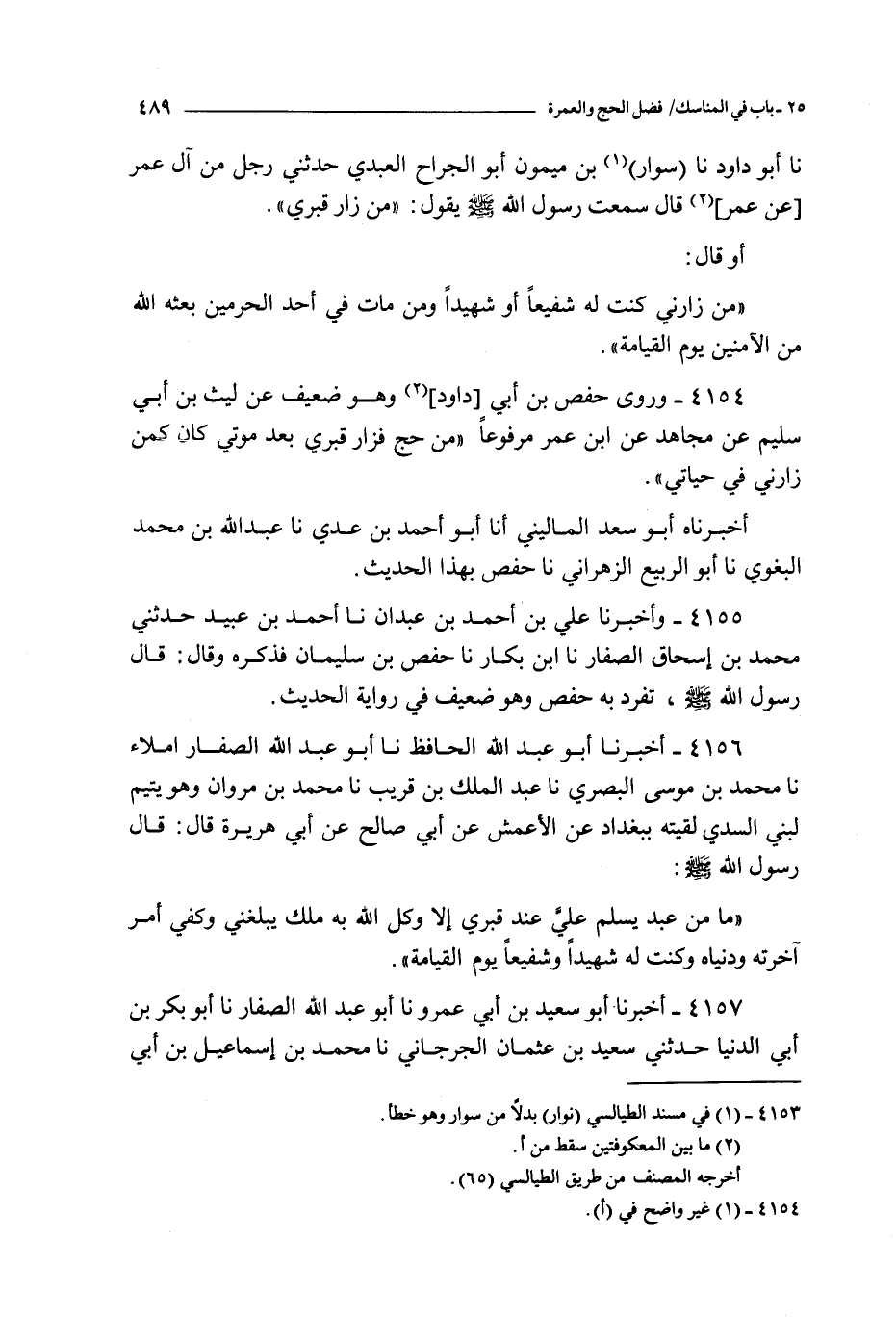 4154 - و روى حفص بن أبي داود و هو ضعيف عن ليث بن أبي سليم عن مجاهد عن ابن عمر مرفوعا : من حج فزار قبري بعد موتي كان كمن زارني في حياتي