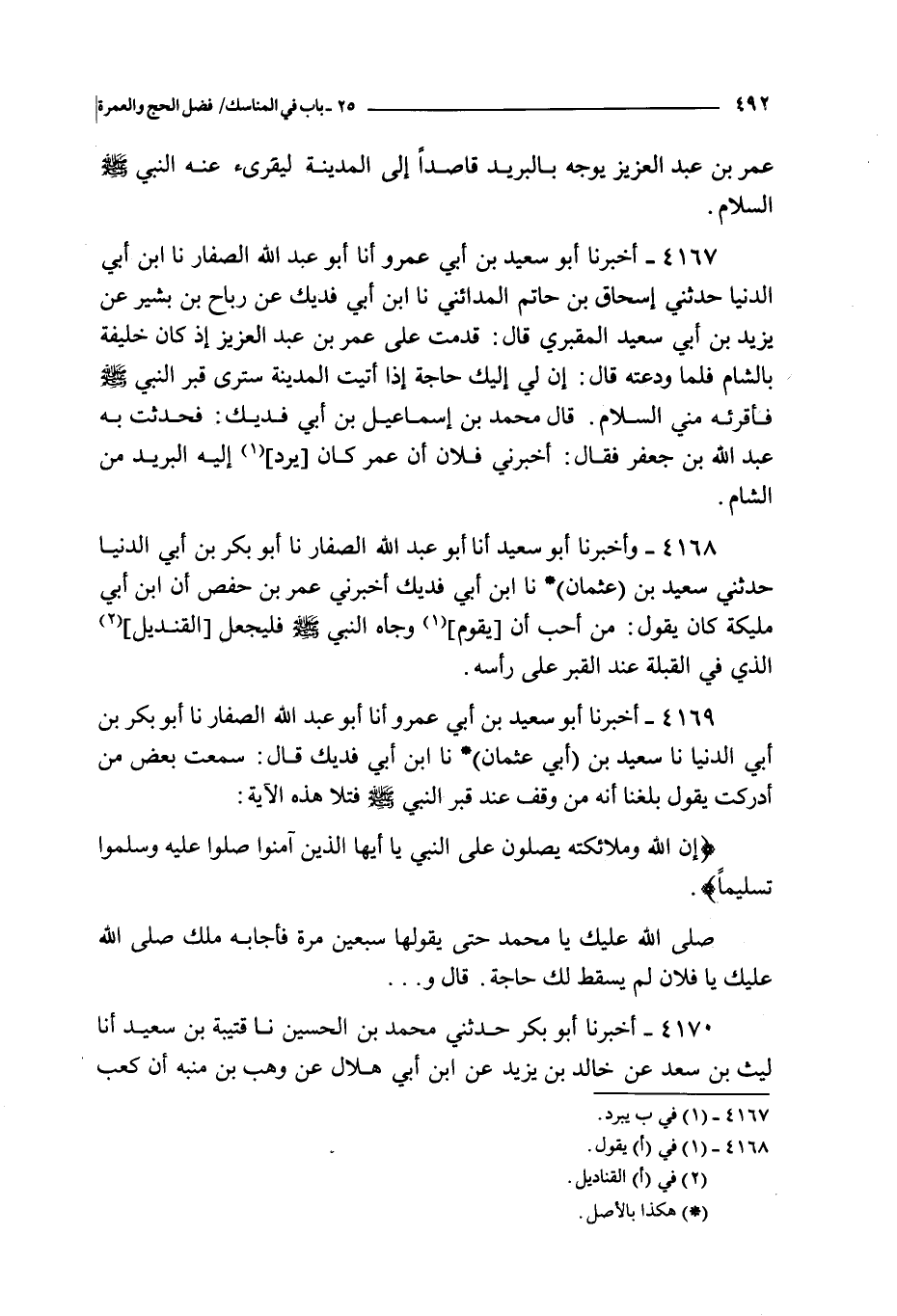4168 - و أخبرنا أبو سعيد أنا أبو عبد الله الصفار نا أبو بكر بن أبي الدنيا حدثني سعيد بن عثمان نا ابن أبي فديك أخبرني عمر بن حفص أن ابن أبي ملكية كان يقول : من أحب أن يقوم وجاه النبي صلى الله عليه و سلم فليجعل القنديل الذي في القبلة عند القبر على رأسه