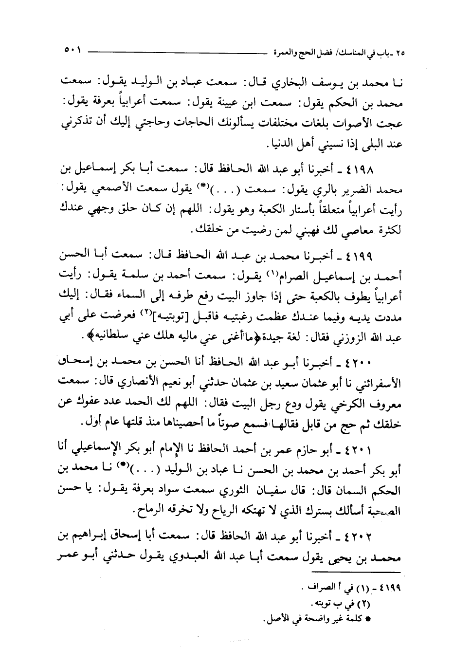 4200 - أخبرنا أبو عبد الله الحافظ أنا الحسن بن محمد بن إسحاق الأسفرائني نا أبو عثمان سعيد بن عثمان حدثني أبو نعيم الأنصاري قال : سمعت معروف الكرخي يقول ودع رجل البيت فقال : اللهم لك الحمد عدد عفوك عن خلقك ثم حج من قابل فقالها فسمع صوتا ما أحصيناها منذ قلتها عام أول