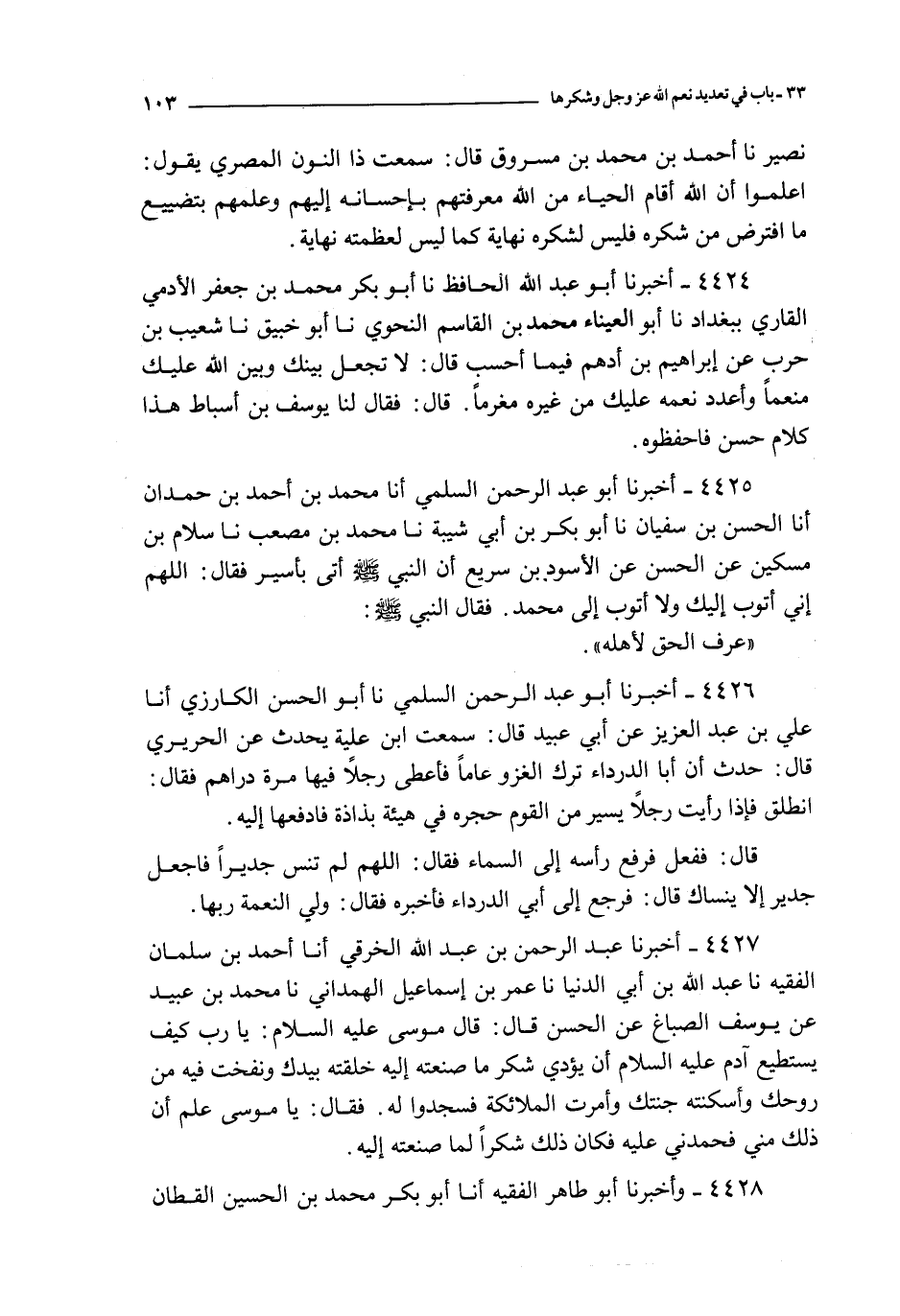 4427 - أخبرنا عبد الرحمن بن عبد الله الخرقي أنا أحمد بن سلمان الفقيه نا عبد الله بن أبي الدنيا نا عمر بن إسماعيل الهمداني نا محمد بن عبيد عن يوسف الصباغ عن الحسن قال : قال موسى عليه السلام : يا رب كيف يستطيع آدم عليه السلام أن يؤدي شكر ما صنعته إليه خلقته بيدك و نفخت فيه من روحك و أسكنته جنتك و أمرت الملائكة فسجدوا له فقال : يا موسى علم أن ذلك مني فحمدني عليه فكان ذلك شكرا لما صنعته إليه