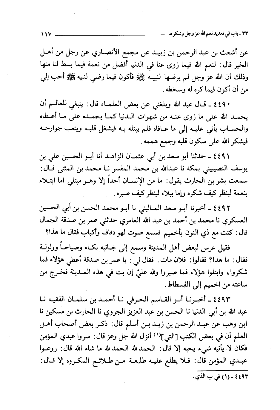 4490 - قال عبد الله و بلغني عن بعض العلماء قال : ينبغي للعالم أن يحمد الله على ما زوى عنه من شهوات الدنيا كما يحمده على ما أعطاه و الحساب يأتي عليه إلى ما عافاه فلم يبتله به فيشغل قلبه و يتعب جوارحه فيشكر الله على سكون قلبه و جمع هممه