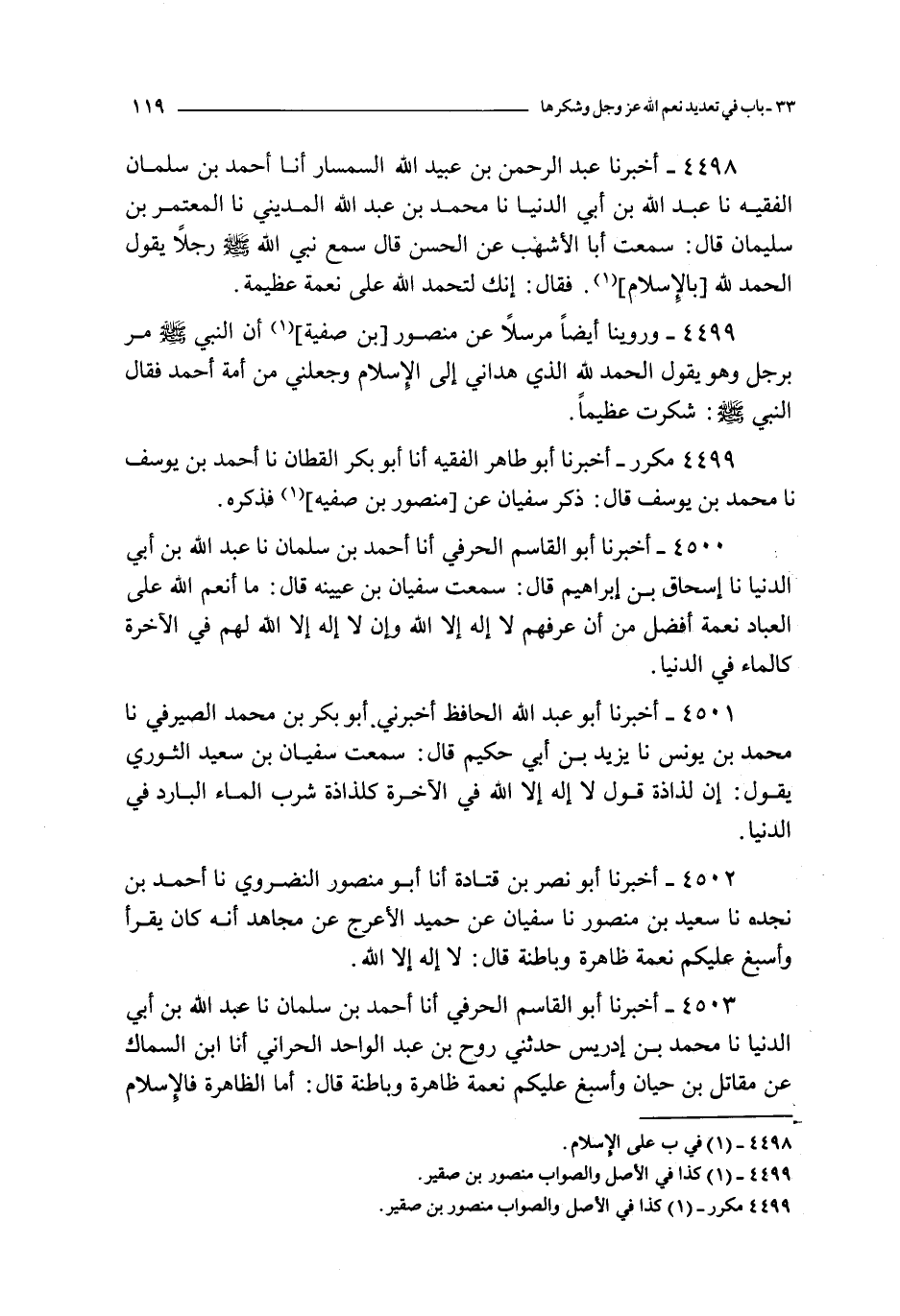 4498 - أخبرنا عبد الرحمن بن عبيد الله السمسار أنا أحمد بن سلمان الفقيه نا عبد الله بن أبي الدنيا نا محمد بن عبد الله المديني نا المعتمر بن سليمان قال : سمعت أبا الأشهب عن الحسن قال سمع نبي الله صلى الله عليه و سلم رجلا يقول الحمد لله بالإسلام فقال : إنك تحمد الله على نعمة عظيمة
