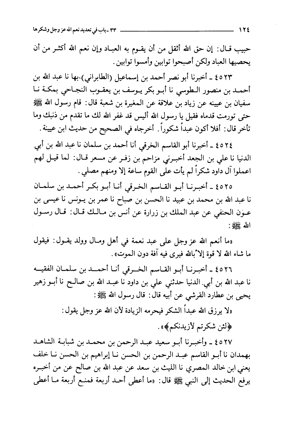 4523 - أخبرنا أبو نصر أحمد بن إسماعيل الطابراني بها نا عبد الله بن أحمد بن منصور الطوسي نا أبو بكر يوسف بن يعقوب النجاحي بمكة نا سفيان بن عيينه عن زياد بن علاقة عن المغيرة بن شعبة قال : قام رسول الله صلى الله عليه و سلم حتى تورمت قدماه فقيل يا رسول الله أليس قد غفر الله لك ما تقدم من ذنبك و ما تأخر قال : أفلا أكون عبدا شكورا أخرجاه في الصحيح من حديث ابن عيينة