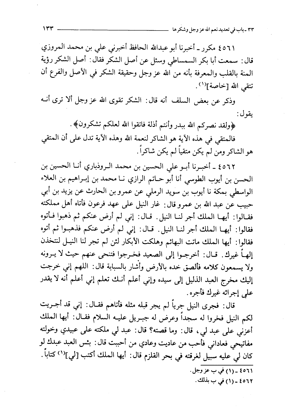 4561 - مكرر ـ أخبرنا أبو عبد الله الحافظ أخبرني علي بن محمد المروزي قال : سمعت أبا بكر السماسطي و سئل عن أصل الشكر فقال : أصل الشكر رؤية المنة بالقلب و المعرفة بأنه من الله عز و جل و حقيقة الشكر في الأصل و الفرع أن تنقي الله خاصة