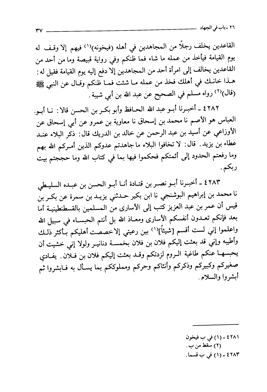 4283 - أخبرنا أبو نصر بن قتادة أنا أبو الحسن بن عبده السليطي نا محمد بن إبراهيم البوشنجي نا ابن بكير حدثني يزيد بن سمرة عن بكر بن قيس : أن عمر بن عبد العزيز كتب إلى الأسارى من المسلمون بالقسطنطينية أما بعد فإنكم تعدون أنفسكم الأسارى و معاذ الله بل أنتم الحبساء في سبيل الله و اعلموا إني أست أقسم شيئا بين رعيتي إلا خصصت أهليكم بأكثر ذلك و أطيبه و إني قد بعثت إليكم فلان بن فلان بخمسة دنانير و لولا إني خشيت أن يحبسها عنكم طاغية الروم لزدتكم و قد بعثت إليكم فلان بن فلان يفادي صغيركم و كبيركم و ذكركم و حركم و مملوككم بما يسأل به فابشروا ثم أبشروا و السلام