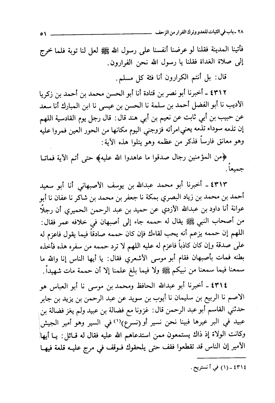 4312 - أخبرنا أبو نصر بن قتادة أنا أبو الحسن محمد بن أحمد بن زكريا الأديب نا الفضل أحمد بن سلمة نا الحسن بن عيسى نا ابن المبارك أنا سعد عن حبيب بن أبي ثابت عن نعيم بن أبي هند قال : قال رجل يوم القادسية اللهم إن تذمه سوداء تذمه يعني امرأته فزوجني اليوم مكانها من الحور العين فمروا عليه و هو معانق فارسا فذكر من عظمه و هو يتلوا هذه الآية :