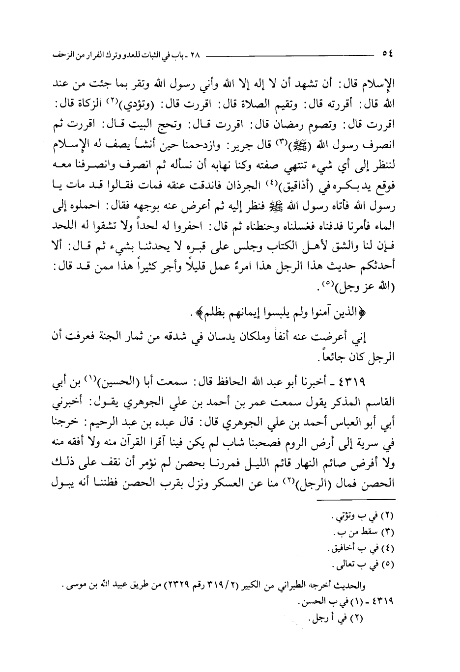 4319 - أخبرنا أبو عبد الله الحافظ قال : سمعت أبا الحسين بن أبي القاسم المذكر يقول سمعت عمر بن أحمد بن علي الجوهري يقول : أخبرني أبي أبو العباس أحمد بن علي الجوهري قال : قال عبده بن عبد الرحيم : خرجنا في سرية إلى أرض الروم فصحبنا شاب لم يكن فينا أقرا القرآن منه و لا أفقه منه و لا أفرض صائم النهار قائم الليل فمررنا بحصن لم نؤمر أن نقف على ذلك الحصن فمال الرجل منا عن العسكر و نزل بقرب الحصن فظننا أنه يبول فنظر إلى امرأة من النصارى تنظر من وراء الحصن فعشقها فقال لها بالرومية كيف السبيل إليك قالت حين تتنصر و نفتح لك الباب و أنا لك قال ففعل فادخل الحصن قال : فقضينا غزاتنا في أشد ما يكون من الغم كان كل رجل منا يرى ذلك بولده من صلبه ثم عدنا في سرية أخرى فمررنا به ينظر من فوق الحصن مع النصارى فقلنا يا فلان ما فعل قراءتك ما فعل علمك ؟ ما فعل صلاتك و صيامك ؟ قال : اعلموا أني نسيت القرآن كله ما أذكر منه إلا هذه الآية